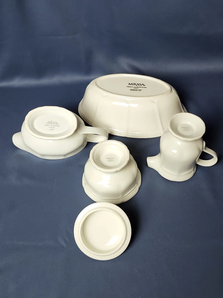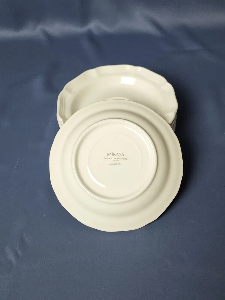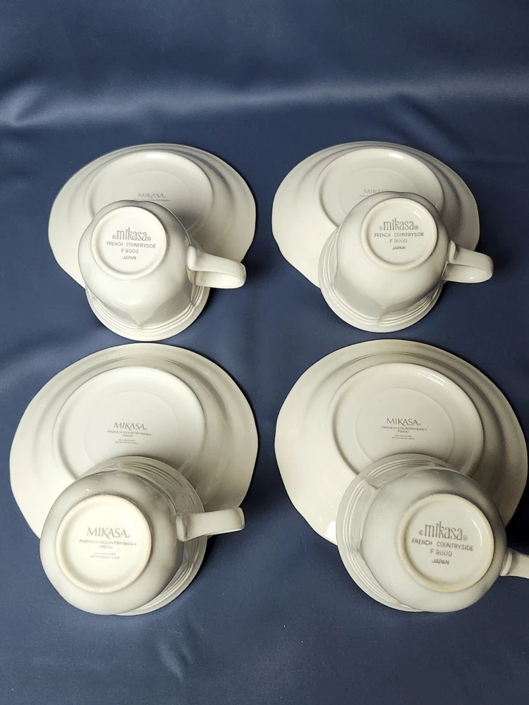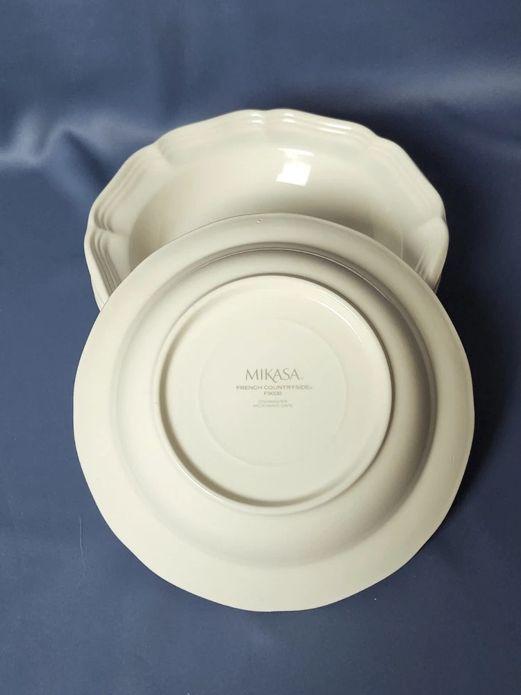 Color: Cream Shape: Round Brand: Mikasa Original/Licensed Reproduction: Original Type: Plates, Bowls, Cups, Saucers, Creamer, Sugar Features: Decorative, Hand Painted, Microwave Safe, Stackable Origin: America Product Line: Countryside Era: Late 20th Century (1970-1999) Care Instructions: Hand Wash Only Style: Contemporary Antique: No Pattern: French Countryside Production Technique: Pottery Time Period Manufactured: 2020-Now Vintage: No Occasion: All Occasions Material: Bone China Country/Region of Manufacture: United States MPN: Does not Apply Production Style: French Countryside Finish: Glossy Handmade: No Set Includes: Bowl, Bread Plate, Cereal Bowl, Cup, Dessert Bowl, Dinner Plate, Fruit Bowl, Plate, Salad Plate, Serving Bowl, Soup Bowl, Creamer, Sugar Bowl, Gravy Boat Backstamp: Painted