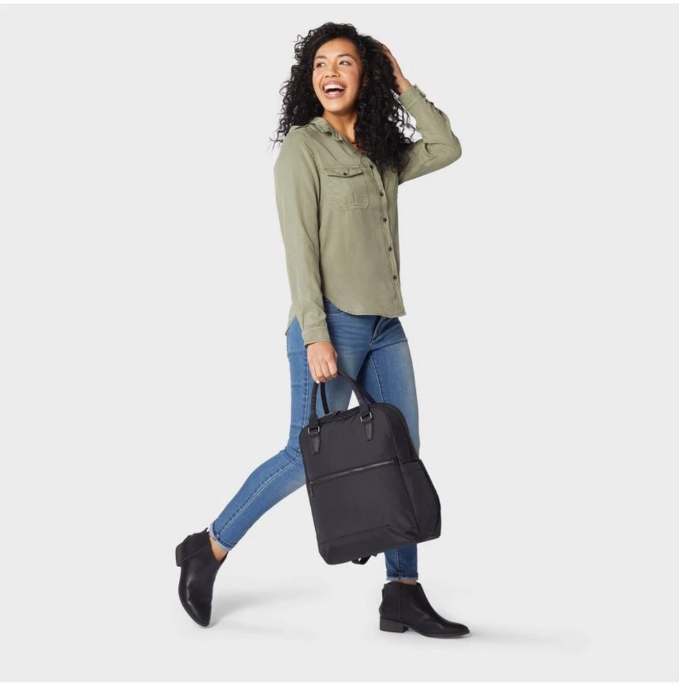 The Open Story Commuter Backpack in black is designed with a padded laptop pocket to securely hold a 15-inch laptop. This versatile backpack is suitable for school, work, or travel, offering a sleek and functional solution for carrying your essentials. Made of durable nylon material, this backpack has dimensions of 16 inches in height, 12 inches in length, and 6 inches in width, providing ample space for your belongings while keeping your laptop protected on the go. Perfect for individuals looking for a stylish and practical backpack for daily use.