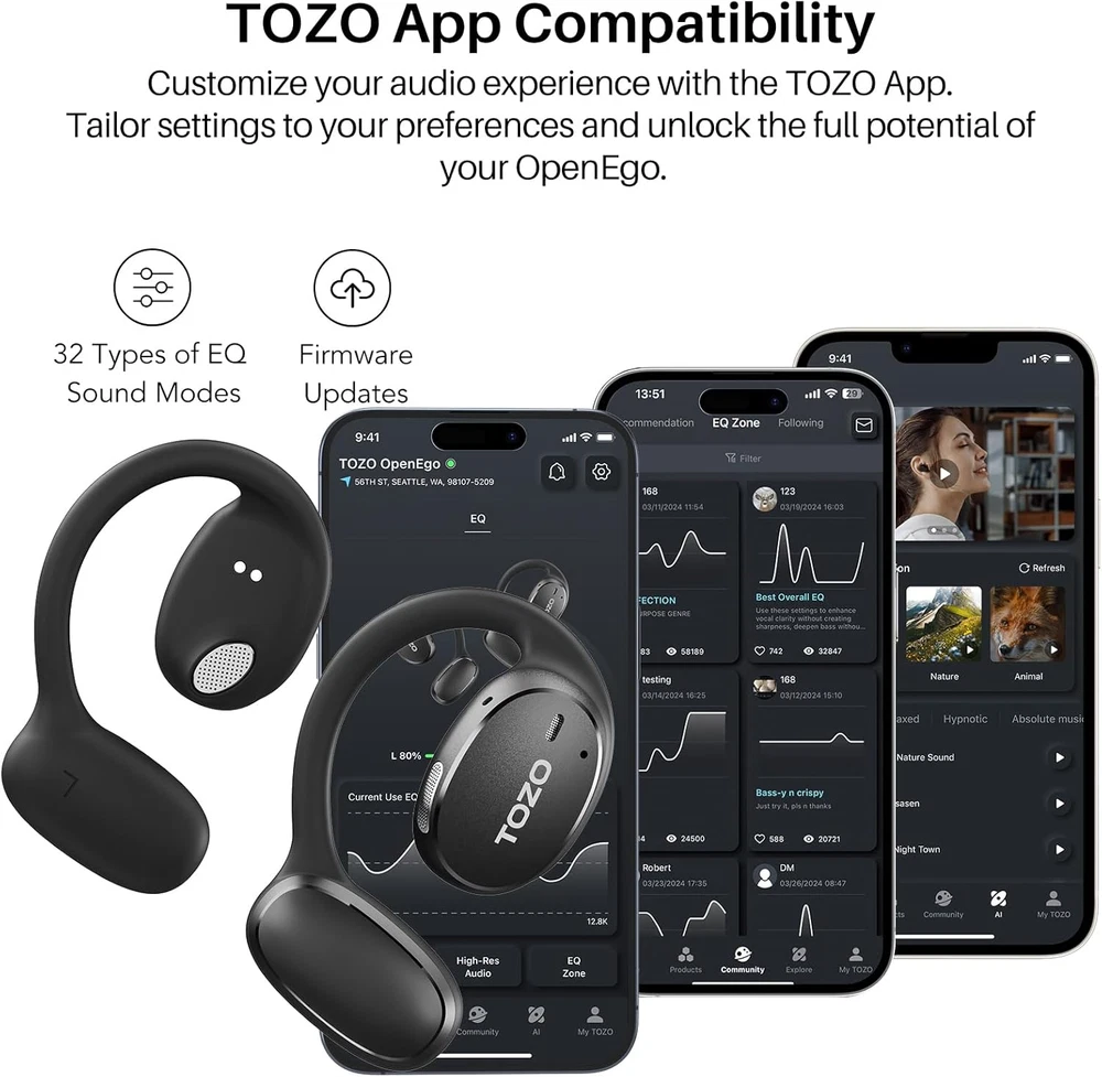 Store New Arrivals Add to Favorite View Feedback Contact Openego True Wireless Open Ear Headphone, 5.3 Bluetooth Sport Earbuds with Earhooks for 80H Playback with Digital Display, 32 EQ Modes Dual Mic Clear Call Sweat-Proof for Running Workout Black Description Item model number T13088 Bluetooth Version 5.3 Style True Wireless Open Ear Headphone, 5.3 Bluetooth Sport Earbuds Number of Items 1 Control Method Touch Is Electric Yes Frequency Response 20 KHz Theme Animal / Anime / Cartoon / Fantasy / TV Series / Video Game / Sport / Music / Gaming / Motorcycling / Office Meetings Battery Life 15 Hours Noise Control Sound Isolation Bluetooth Range 10 Meters Controller Type APP, Touch Control Type App Control/Touch Control Is Autographed No Wireless Communication Technology Bluetooth Cable Feature Without Cable Carrying Case Battery Charging Time 2 Hours Product Dimensions 4.02 x 3.66 x 1.65 inches Material Plastic, Metal Carrying Case Width 34.5 Millimeters Carrying Case Color Black Age Range (Description) ALL Ear Placement In Ear Impedance 16 Ohm Form Factor Open Ear Specific Uses For Product Travel, Business / Fitness / Entertainment / Gaming / Professional / School / Sleeping / Travel / TV Series / Video Game / Sport / Music / Gaming / Motorcycling / Office Meetings Included Components Charging Case, OpenEgo Wireless Open Earbuds, Quick Guide & User Manual, USB-C® (A to C) cable (20") Carrying Case Battery Capacity 600 Amp Hours Model Name OpenEgo Unit Count 1.0 Count Carrying Case Height 8.25 Millimeters Water Resistance Level Water Resistant Carrying Case Material Metal Item Weight 5.3 ounces Connectivity Technology Bluetooth, Wireless Open Earbuds Headphones Jack Bluetooth Audio Driver Type Dynamic Driver Carrying Case Length 20.4 Millimeters Color Black Sensitivity 100 dB Number of USB 2 Ports 1 Compatible Devices Bluetooth-enabled devices Audio Latency 45 Milliseconds Batteries 1 Lithium Metal batteries required. (included) Recommended Uses For Product Audio Monitoring / Calling / Cycling / Disc Jockey Use / Exercising / Gaming / Motorcycling / Office Meetings / Radio Communication / Running / Skateboarding / Snowboarding / Studio Carrying Case Battery Average Life 80 Hours Audio Driver Size 16.2 Millimeters Carrying Case Weight 10.9 Grams Earpiece Shape [Hybrid] Unparalleled Audio - TOZO OpenEgo boasts a 16.2mm large dynamic driver, delivering high-fidelity audio with a motor coil approximately 30% larger than conventional types. Enhanced by TOZO OrigX Acoustics, it offers translucent highs and immersive lows. Open Hearing&Focused Calling - In-ear free design, comfortable to wear, whether walking, cycling or driving, you can always sense the sound of outside, to be awareness and connecting. When calling, the Open ear earbuds effect of dual-microphone noise cancelling, can filter out the external noise, so that you and your friends clear calls as face to face chat. Ear Fit for Running Workout - Including pair of ear support for improving fit in package, ensuring they stay in place even during active workouts. Furthermore, OpenEgo sport headphone takes to IPX5 sweat-resistant, making it perfect for intense workouts and outdoor activities. TOZO APP Integration - Switch freely between 32 EQ modes with our exclusive TOZO APP. Customize sound settings, adjust equalizer preferences, and explore a wide range of features to personalize your audio journey. 80 Hours Playtime&LED Power Display - OpenEgo comes with a charging case that provides up to 80 hours of playtime, which is enough to play about 1,200 songs or hold 80 meetings (one meeting per hour), the package comes with Type-C USB cable that is convenient for you to charge the product quickly. In addition, the LED display on the charging case ensures that you always know the battery status. Product Description Open Listening, Comfortable Wear Designed for comfort, OpenEgo's non-intrusive design lets you enjoy your surroundings strolling the streets or immersed in work and entertainment. Directional Sound, Bass Bliss Experience precision with directional sound technology, minimizing sound leakage. With dynamic low-frequency enhancement, OpenEgo delivers a breathtaking audio quality. Directional Sound, Bass Bliss Experience precision with directional sound technology, minimizing sound leakage. With dynamic low-frequency enhancement. 16.2mm Large Dynamic Driver 14% larger than common open-ear headphones. Immerse yourself in clear highs and deep bass. Customized Experience Customize your audio experience and tailor all the settings to your preferences with the TOZO APP. One-Step Pairing Effortlessly connect to your devices with one-step pairing. Bluetooth 5.3 Technology Bluetooth 5.3 technology offers improved stability and faster pairing, providing high-quality audio. 1 Superior Sound 2 Long Battery Life 3 TOZO APP 4 Effortless Connecting 5 Bluetooth 5.3 Dual-Mic Call Noise Cancellation The advanced AI algorithms and dual-mic systems filter out unwanted noise from your surroundings, ensuring your voice remains clear and intelligible during calls. Enhanced Privacy The directional sound technology ensures that your audio remains private and prevents disturbing those around you, making it ideal for use in public. Safe Drive Enjoy your music without compromising your ability to hear important traffic sounds or sirens, promoting a safer driving experience. Max Comfort for Workouts The open-ear design makes air circulate freely, reducing moisture buildup and discomfort, and ensuring better ventilation and ear hygiene. Seamless Communication Stay connected and enjoy seamless communication without the need to remove your earphones or pause your audio playback. Smart LED Display The smart LED display on the charging case keeps you informed about the battery and charging status at a glance. Seamless Touch Control Effortlessly manage playback, answer calls, and access your voice assistant with just a tap. ABOUT US We offer the best prices around on hi