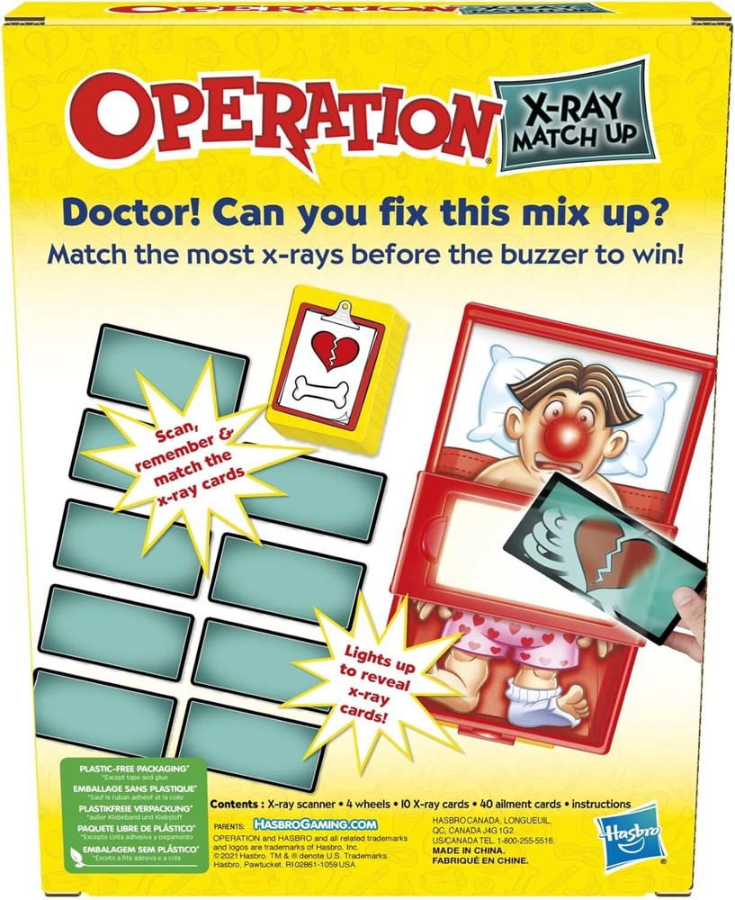 Further Details Title: Operation X-Ray Match Up Board Game for 2 or More Players, Matching Game for Kids Ages 4 and Up, with Lights and Sounds Condition: New Description: PRODUCT DESCRIPTION Doctor! Can you fix this mix up? Cavity Sam's X-rays got all mixed up and he needs your help! Operation X-Ray Match Up is a fun matching game for kids. It includes a pretend "X-ray" scanner that lights up to reveal the X-ray cards. There's no reading required to play the game…but players have to be quick! An automatic timer counts down as players pick an ailment card, try to remember which X-ray card has a matching picture, and then scan it to find out if it's a match. If the buzzer sounds and Cavity Sam's nose lights up, that person's turn is over. This board game is a great choice for a birthday gift or a fun holiday gift for kids ages 4 and up. Hasbro Gaming and all related trademarks and logos are trademarks of Hasbro, Inc. SAFETY WARNING WARNING: Small parts may be generated. Not for children under 3 years. Brand: Hasbro Gaming Color: Red Material: Plastic Theme: Racing Release Date: 01/01/2022 Language: English Age Level: 4 years and up Min. Number of Players: 2 Item Length: 41mm Item Width: 200mm Item Height: 266mm Type: Board Games MPN: F4259 Item Weight: 289g MATCHING GAME FOR KIDS: Match to win! The Operation X-Ray game features a twist on classic Operation gameplay with a pretend "X-Ray" feature that lights up to reveal the X-Ray cards MEMORY GAMEPLAY: Uh-oh! Cavity Sam's X-ray pictures are mixed up! Kids race against the automatic timer to remember where the X-ray cards are placed as they try to match their ailment cards CARD MATCHING: Players pick an ailment card from the pile, then choose an X-ray card they think has a matching picture. The scanner reveals if it's a match – if it is, they get to keep the card AVOID THE BUZZER: Bzzzzt! When the buzzer sounds and Sam's red nose lights up…time's up! The player who has collected the most ailment cards wins the game FUN KIDS' GAME: The Operation X-Ray Match Up game is a great choice for your child's play date or to keep kids entertained on a rainy day. It makes a great birthday gift for kids ages 4 and up Missing Information? Please contact us if any details are missing and where possible we will add the information to our listing.