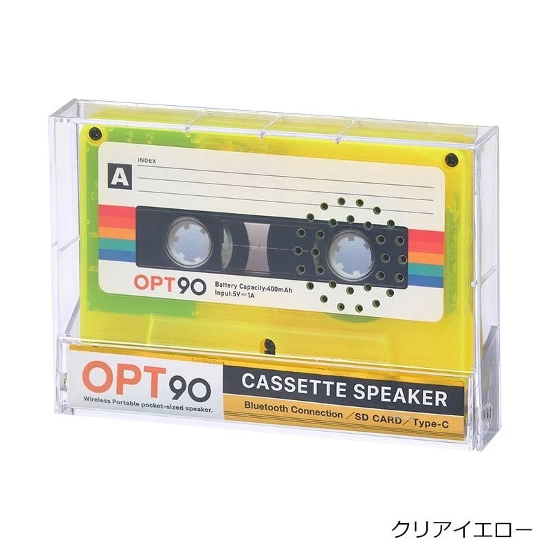 Opt! Opt90 Cassette Tape-Type Speaker Bluetooth Portable Speaker Clear Yellow Description About This Items A retro and stylish cassette tape-type Bluetooth speaker has just arrived! It also supports SD cards, allowing you to enjoy it like an old mixtape♪ Lightweight and compact, the storage case doubles as a stand. When you close the lid, the sound quality changes, giving you the ability to adjust the sound based on how you use it. Retro and Stylish Speaker This Bluetooth speaker is designed to resemble the cassette tapes that were hugely popular in the 80s and 90s, combining retro aesthetics with modern functionality. SD Card Support You can insert an SD card and enjoy music just like an old mixtape. Note: Only MP3 files on the micro SD card are supported. Storage Case Doubles as a Stand Lightweight and compact, the storage case also serves as a stand. When you close the lid, the sound quality changes, allowing you to adjust it based on how you use it. Important Notes This product is not a cassette tape. It is a Bluetooth speaker inspired by cassette tapes. Speaker Type: Portable Battery Capacity: 400mAh Battery Life: 6 hours Charging Time: 2 hours Bluetooth Version: Bluetooth 5.3 NFC Function: Not supported Dimensions Width: 100mm (Main body) / 110mm (Case) Height: 63mm (Main body) / 77mm (Case) Depth: 12mm (Main body) / 19mm (Case) Weight: 80g (Including dedicated case) Color: Yellow Other Specifications Main Body Material: ABS resin, Iron Size: Approx. 100×63×12mm Weight: Approx. 80g (Including dedicated case) Bluetooth Version: 5.3 Battery Capacity: 400mAh (Lithium-ion battery) Rated Voltage: 5V = 1A Power Consumption: 2W Continuous Playback Time: Approx. 6 hours (at maximum volume) Charging Time: Approx. 2 hours Certification: Technical Standards Conformance Certification: R219-239467 Shipping [Economy Shipping] No Tracking 2-4 Weeks [Expedited Shipping] FedEx (+Tracking Number) It arrives in 2 days to 1 week. Please note: The lead time for shipping depends on flight schedules and customs clearance procedures for each country. Due to a reduction in airplane availability, shipping times may be longer than usual. International Buyers: Please note that import duties, taxes, and charges are not included in the item price or shipping cost. These charges are the buyer?s responsibility. Prior to bidding or buying, please check with your country?s customs office to determine what these additional costs will be. We do not mark merchandise value below its actual value or mark items as gifts, as this is prohibited by Japan and international government regulations, as well as eBay rules. About Importer's Obligation Import duties, taxes, and charges are not included in the item price or shipping cost. These charges are the buyer's responsibility. Please check with your country's customs office to determine what these additional costs will be prior to bidding or buying. Thank you for your understanding.