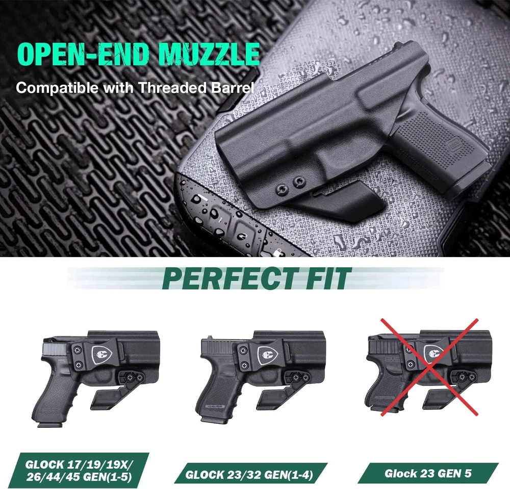 IWB Kydex Holster Optic Cut & Claw Compatible with Glock 17/19, G43/43XNo MOS, G2C/G3C, GX4, G3, P320, P365, LC9, Security 9, S&W M&P 9/.40, Shield 9/40, Shield EZ, SD9VE, Hellcat, Right COMPATIBILITY - Compatible with Glock17/19/19X/44/45 Gen(1-5) & Glock 23/32 Gen(3-4) - Glock 17 barrel end would come out from holster inch - Incompatible with Glock 23 Gen 5 & Glock 32 Gen 5 or any Laser/Light OPTIC CUT & CLAW - This Glock 19 holster are designed to accommodate wide variety of optics - Claw can eliminate printing made holster more concealable when carrying(equipped with extra screws for no claw style carry) COMPENSATOR & OPEN MUZZLE CUT - Glock 19 holster can accommodate with various compensators - Over-Cut open muzzle accommodate with threaded barrel FULL LENGTH SWEAT GUARD & POSI-CLICK AUDIBLE SYSTERM - Full length sweat guard can prevent sweat towards your pistol - You can hear a clear "CLICK" sound when firearm was firmly seated INCH US KYDEX MADE - The glock 19 IWB holster is made of .08" (2mm) US Kydex material, which possess rugged, durable, waterproof, washable and lightweight characters - Super suitable for daily concealed carry HAND POLISHED EDGE & SMOOTH INNER STRACTURE - All Kydex holsters edge are polished by hand - Smooth inside structure ensure no scratch nor wear ADJUSTABLE CANT & RETENTION - Adjustable carry angle from -5 to +20 Degrees - Adjustable retention for suitable tightness satisfaction - ALL holsters possess satisfaction, if for any reason you are unsatisfied, please feel free to contact our 24/7 Customer Services for or a resolution of your purchase price, we stand behind the quality of our work!