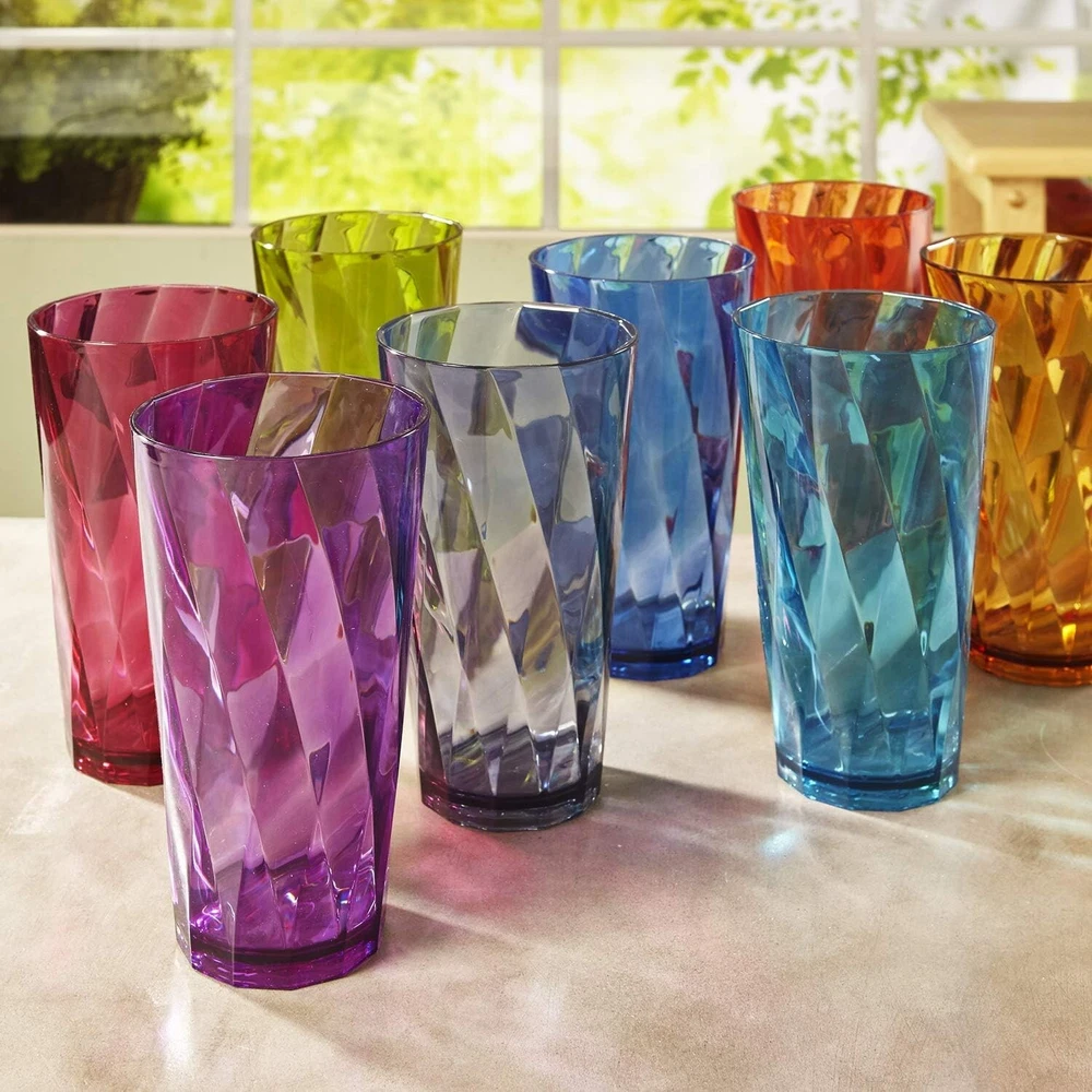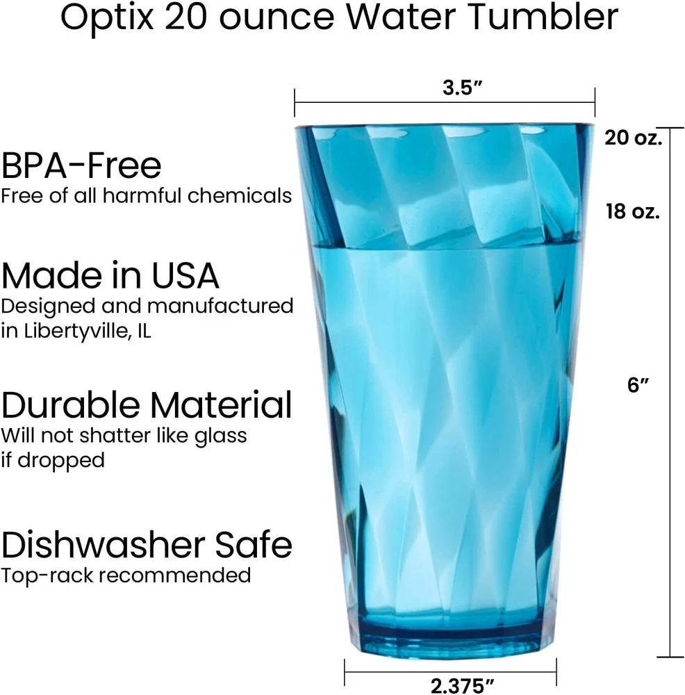 Optix Plastic Reusable Drinking Glasses Set of 8 20oz Water Cups in Jewel Tone Colors | BPA-Free Tumblers, | Top-Rack Dishwasher Safe Elevate your drinkware collection with our American-made 8-piece set that includes eight 20 ounce glasses. Made from high-quality plastic material that's free of harmful chemicals, our cups provide a reliable option for you and your party guests. These cups feature 8 brilliant rainbow colors, a stylish twist pattern, a smooth top edge for easy sipping, and a thick base that provides a glass-like appearance, making them both comfortable and stylish. This design will add an updated look to your kitchen aesthetic. Think outside the house- This Optix plastic glass set is a great addition to any college dorm room, first apartment, rv, and camper. Consider adding these as a wedding registry gift for a new household. Stock your home bar for cocktail hour or prepare for morning breakfast, brunch, and dinner with this selection of highball tumblers. Entertain outdoors on the patio, pool, or hot tub with these durable and shatterproof pieces. The 20 fl. oz. cups (" diameter x 6" tall) are versatile and suitable for any drinkware need. Elevate Your Drinkware Experience Enjoy the convenience and durability of our American-made plastic tumblers, perfect for everyday use or special occasions. Shatterproof and dishwasher-safe, these versatile glasses are a must-have for any home.
