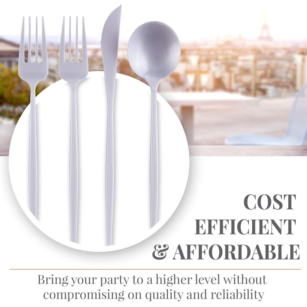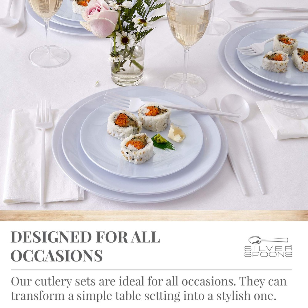 OPULENCE COLLECTION DISPOSABLE SPOONS | Heavy Duty Plastic Flatware | 20 Spoons | for Upscale Wedding and Dining (Pearl) PREMIUM QUALITY – This beautiful and versatile white plastic silverware set is composed of high-heavyweight plastic materials rendering it strong enough for every type of food you might be serving. These flatware are 100% food and safe to use for a fine dining experience EXQUISITE DESIGN – This Opulence disposable spoons has a simple design which gives them a classy and elegant accent. The white color has a pearl like appearance which makes it a perfect product to complement any color scheme and upgrade your event to a higher standard. COST EFFICIENT & AFFORDABLE: With this dazzling set of disposable flatware you get the look of high-end silverware, at an affordable price. Bring your party to a higher level without compromising on quality and reliability with this elegant Opulence flatware set. DESIGNED FOR ALL OCCASIONS: Our cutlery sets are ideal for all occasions. They can transform a simple table setting into a stylish . These flatware are a perfect option for upgrading banquets, weddings, engagements, birthdays, parties, baby showers, upscale catering and home dinners, etc. CONVENIENCE – These spoons are disposable; however, you can reuse them if you wish. Package Includes: 20 spoons. Check out our matching plates, flatware and more from Opulence Collection
