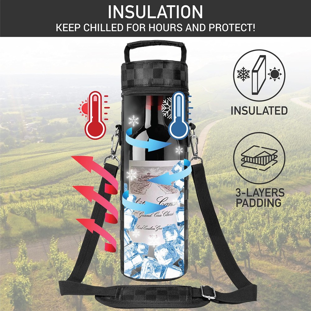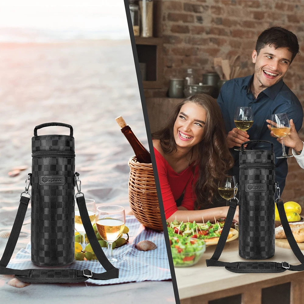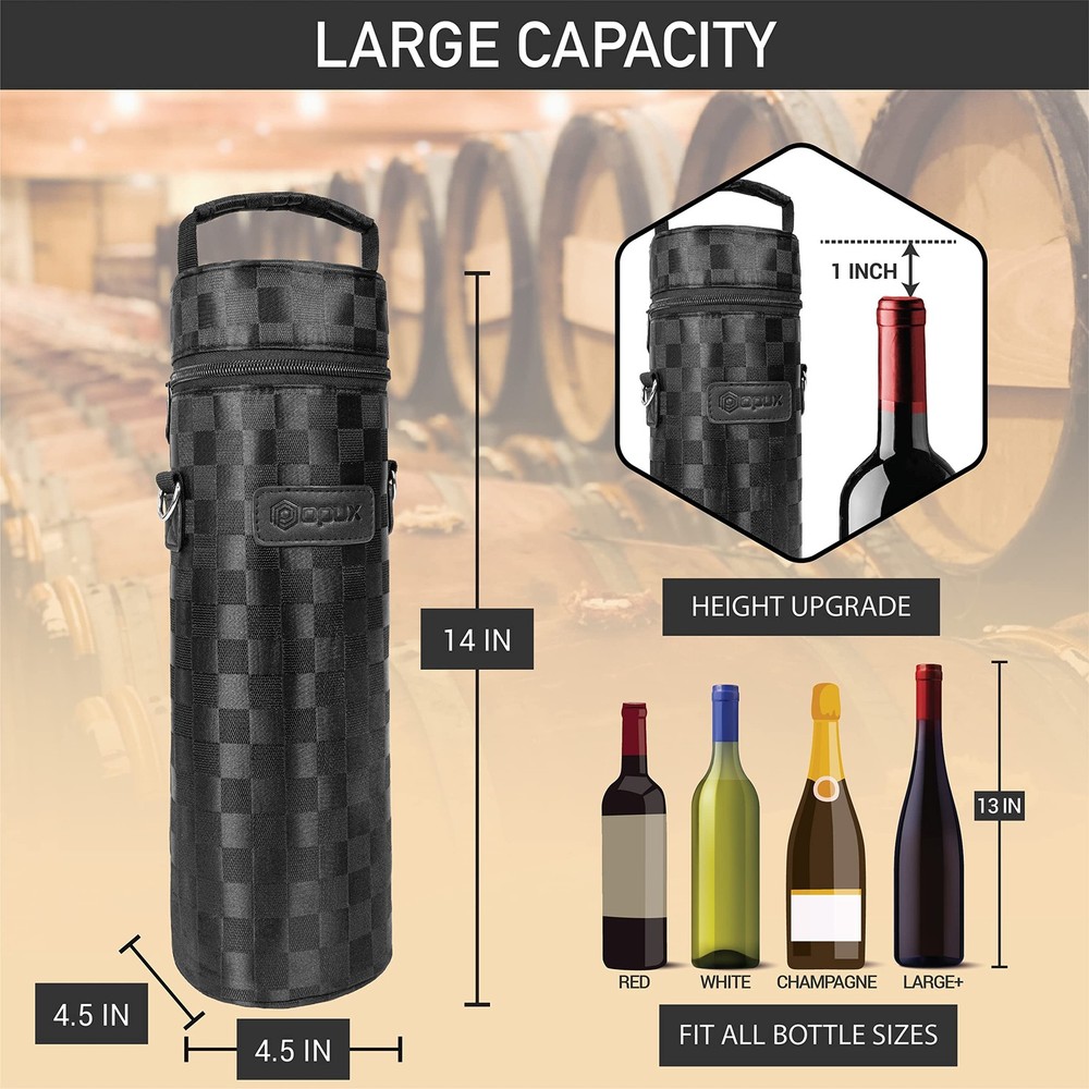 OPUX Premium Insulated One Bottle Wine Carrier Bag with Adjustable Shoulder Strap and Zipper, Reusable Soft Wine Cooler Tote for Travel Beach Picnic Wine Gift for Women Men Perfect for carrying wines with you while you're eating at a restaurant or a picnic, this Premium Insulated 1 Bottle Wine Tote Carrier by OPUX is equipped with a removable shoulder strap and zipper closure for easy opening. This wine tote carrier allows you to store a single standard bottle of wine or champagne It is lightweight and versatile, making it perfect to carry to any special occasion. This Premium Insulated 1 Bottle Wine Tote Carrier by OPUX measures 14 x 4.5 x 4.5 (H x L x W). OPUX creates quality products for your many lifestyles. Our Vision To provide premium kitchen and wine products that greatly simplifies your life. We will continue to innovate and bring exciting products to market so you can achieve more in life! Our Products At OPUX, we offer an extensive line of kitchen tools (such as salt & pepper mills), lunch bags, and wine bags/accessories made of highest quality for all occasions. Our products are meticulously designed with materials and functions that truly simplify your life so you can focus on creating your favorite meals or entertaining your guests. WINE BAG CARRIER 1 BOTTLE: Single bottle wine tote with shoulder strap and zipper is the perfect wine bag for travel, picnic, take to the beach, transport wine, camping, outdoor concerts, restaurant, BYOB, dinner, BBQs, gatherings, or party. Reusable portable one bottle wine holder is insulated and is an essential accessory for traveling, wine gift basket for women, men, and wine lovers, drinker. Celebrate special occasions or getaways with your loved ones with a chilled bottle of wine! INSULATED WINE COOLER TOTE: Thermal insulated wine bag regulates temperature to keep your wine bottles chilled for hours. Perfect wine cooler beach bag for picnics, camping, and road trips. Wine side bag briefcase features 3 layers of insulation and zippered close secured top to maintain a steady temperature weather its chilled, room temp, or frozen for liquor bottles/beverages. Soft wine cooler with zipper is easy to clean and a picnic essential with soft leakproof lining that prevents spills. WINE BOTTLE PROTECTION PURSE: Portable wine carrier bag is perfect for protecting your wine while transporting wine for travel, BYOB to restaurants, wine tastings, beach outdoor trips. The padded protective lining protects your glass bottle from breaking during car travel and comes with an adjustable shoulder strap for comfort. Wine holder bag can be used as a wine suitcase briefcase for airplane air travel. Our wine cooler bag is the best way to ensure your wine is stored properly. WINE GIFTS FOR WOMEN WINE LOVERS: A perfect wine accessory or vino gift for wine enthusiasts, sommeliers, and wine drinkers. Great gift set idea for wine lovers, women, family, friends and father during Christmas, Valentines Day, Anniversary, Fathers day and Birthday. The wine carrier is also a timeless holiday present for mom, coworkers, adult couples during weddings, housewarmings, engagements, bridal shower, hostess, secret santa, white elephant and gift basket swap. PREMIUM PICNIC WINE CHILLER: OPUX premium insulated one bottle wine tote carrier measures 14 x 4.5 x 4.5 (H x L x W). | Fits most standard 750ML wine bottles. Made from high-quality 600D polyester to ensure maximum durability and PU leather trim for a touch of elegance. Zipper secured closure with adjustable removable shoulder strap and top handle for convenience. Classy wine bag set also carry other alcohol bottles such as liquor, champagne, spirits, drinks, beer, and wine glasses.