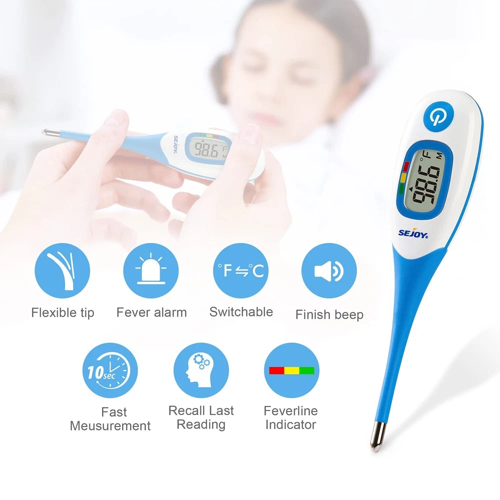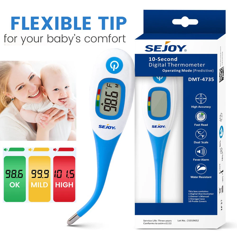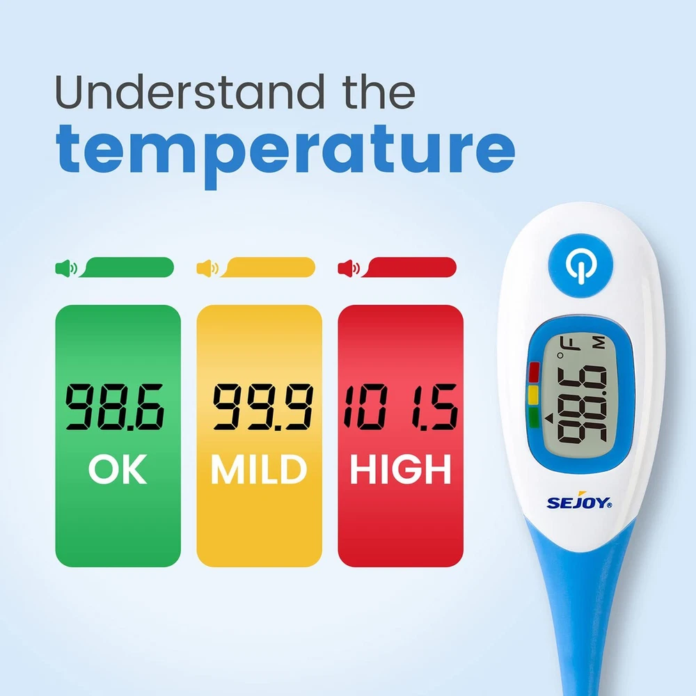 Product Description Sejoy - Professional Manufacturer for 20 years in Medical Sejoy focused on Personal Healthcare, Clinical Diagnosis and Mother and Baby care. We aim to help you to know your temperature at home in a more easier and comfortable way. We want to be your support when fever hits or basal body temperature tracking. Sejoy started manufacturing healthcare medical devices since 2002 , we focused on blood pressure monitors, thermometers, blood glucose monitors and other customerized home-care products. At this moment we have over 1500 workers working with automation equipments and semi-automatic equiment. All products are 100% inspected before shipment. With nearly 20 years production experience with automation to ensure quality consistency, and skilled R&D for keep improving. The quality and accuracy is tested by our clients all over the world. We warmly invite you to be one of our beloved customer. Fever Alarm This is a simple thermometer for kids and adults,no more memoring the fever temperature, you can tell whether the temperature is high or not just by looking at the color bar which the arrow points to.Like traffic lights. Recall Last Reading This termometro digital adults and kids, allows you to check your last reading result, so you can track the temperature curve and see if the temperature getting better or not. Finish Beep According to customer feedback, the finish Beep is a little soft as we don't want this to be loud to be annoying, you may need to pay a little more attention to this. Normally the buzzes are “ Bi-Bi-Bi-B i-”; Alarm beeps more rapidly when temperature reaches 100.0℉ (37.8 ℃) or higher ,and the buzzes “ Bi-Bi-Bi----- Bi-Bi-Bi------- Bi-Bi-Bi” Features of Sejoy Thermometers How do Sejoy digital thermometer reads the temperature in 5-10 seconds The thermometer will enter into the Actual Measurement after 3 minutes. You will get your real temperature besides the previous predictive temperature. One Press On The Digital Thermometer To Start Measuring 5s Fast Reading & High Accuracy: This digital thermometer provides accurate, simple to understand readings in only 5-10 seconds, so you can get results quickly. It also has a memory feature that recalls and displays last temperature taken, help track the temperature change. Easy to Read and Fever Alarm : The three-colour color-bar Fever In Sight printed on the thermometer helps understand temperature easily. Arrow on the display Points at green suggests a normal temperature, yellow signifies an elevated temperature and a red display indicates a high temperature. Digital thermometers provide fast, easy to read temperatures so you can tell if you or your child has a fever quickly and accurately. Versatile: With 5-10 second test time, oral,rectal, under arm, bath water mode provided , also equiped with soft silicone tip, reliable stainless steel probe, waterproof design, it is perfectly to be used as thermometer for adults and kids, pets, as baby thermometer, rectal thermometer, water thermometer, dog thermometer. The all in one thermometer for home use. Easy to use and Hygenic: The digital thermometer is waterproof for easy cleaning. Simply clean under the tap with a bit of soap. 10pcs disposal probe covers also included for use as oral thermometersand rectal thermometers, hygienic between use. It comes with a sanitary storage case, a battery, and probe covers, ready to use. Special Features: This digital thermometer is easy to read with larger LCD display, beeper alarm, memory display, auto shut off, easily switch the units between ℉ and ℃. Anything you need , pls kindly contact us through ebay message.("Lo" before testing means it hasn't sensed your temperture,which in other says is it's ready to test, "Lo" has nothing to do with the battery.) All in One Thermometer for Adults, Kids, Babies, Infants, Vets Use as: 1.Thermometer for Adults, Thermometer for kids(termometro digital adults and kids), as well as thermometer for Pets 2.Oral thermometer,rectal, under arm, bath water thermometers, basal body thermometer Q&A for question in the review: 1. Why the color box of the thermometer marked 10s? The actual testing time of the thermometer is from 5-10s, which you can see on the manual inside the boxes and test by practical measurement. As regular markings ,it is 5s or 8s or 10s.For 5s, some may think it is not true ,for 8s, we know it is not the exact time, so we choose to mark 10s, lower the expectations, and provide the actual time less than 10s. Hope that customers could kindly understand. 2. How to switch Celsius to Fahrenheit? ℉/℃ SWITCHABLE:Temperature readings are available in the or scale (℉/℃; located in the upper right corner of LCD.) 1. Turn on the thermometer. 2. During the last measured value displays, press and hold the On/Off button until ℃ or ℉ showes. 3. Quicky press On/Off button to switch between ℃ and ℉ modes. 4. When the desired unit displays on screen, wait for auto entering into measurement mode.