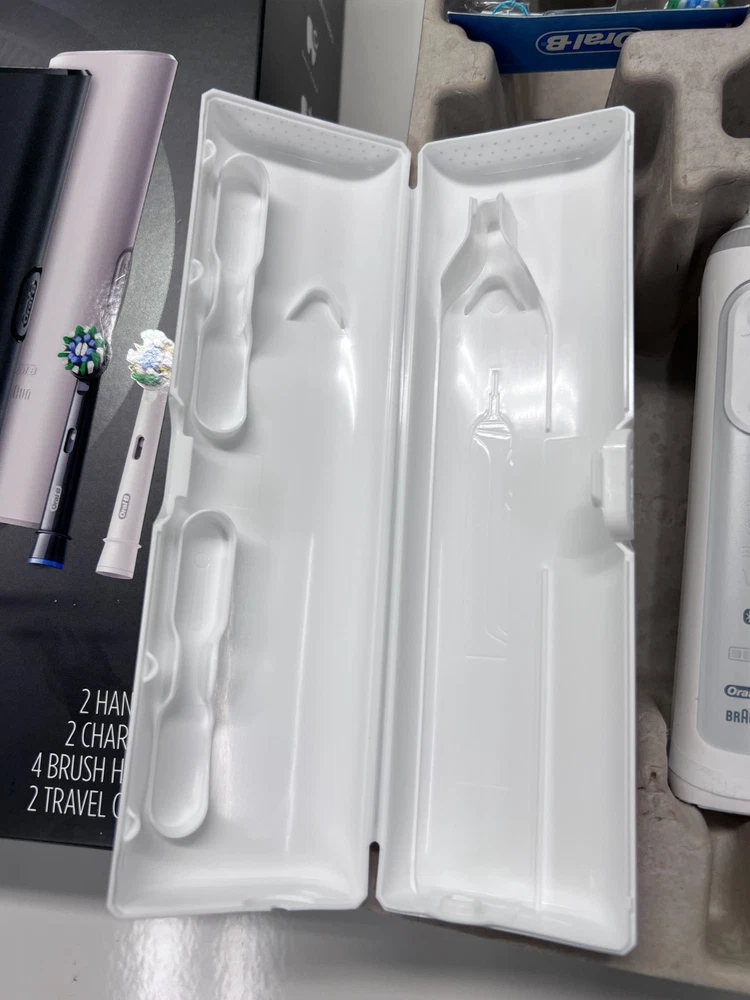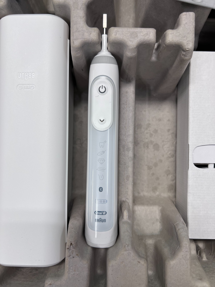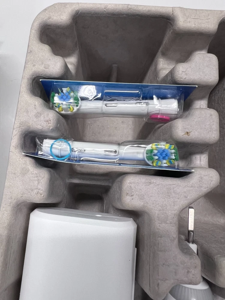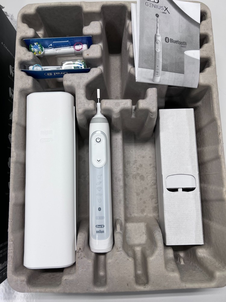 This listing is for ONE (1) Oral-B Genius X AI electric toothbrush taken from a factory 2-pack . The toothbrush is unused , fully functional, and includes original accessories as shown. Powered by AI brushing recognition , the Genius X adapts to your brushing style and helps improve coverage and technique when paired with the Oral-B app. Included: 1× Oral-B Genius X AI electric toothbrush handle 2× Genuine Oral-B brush heads (new, sealed) 1× Charging base 1× Travel case Instruction manual Ships securely in the original inner packaging shown (not full retail outer box)