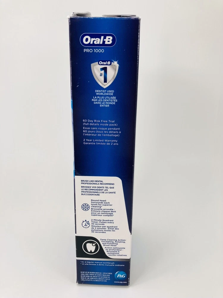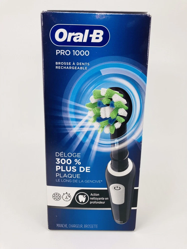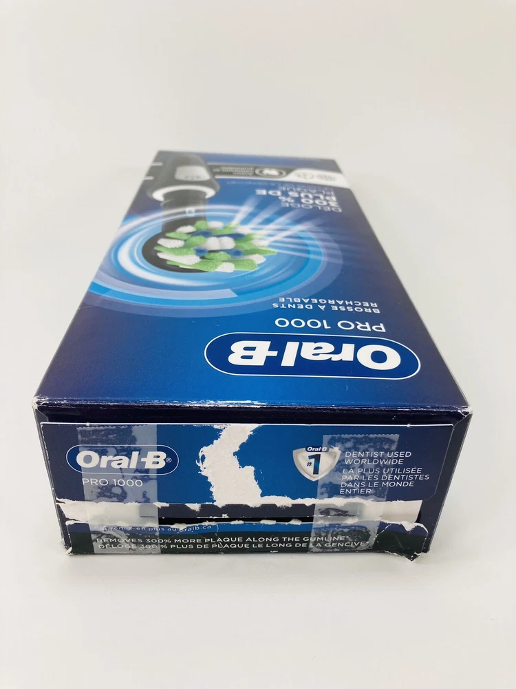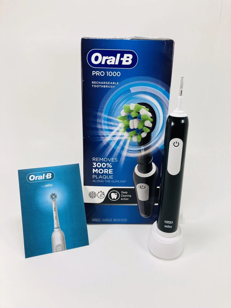 Oral-B Pro 1000 CrossAction Electric Toothbrush, Black Looks like it was used . Brush head not included. Please see the pictures for more details. FREE SHIPPING Clinically proven superior 3D cleaning oscillates and pulsates to break up and remove up to 300 percentage more plaque along the gum line than a regular manual toothbrush The pressure sensor stops the pulsation movement if you brush too hard and the in handle timer helps you brush for a dentist recommended 2 minutes 1 Mode, Daily Clean, rotates to break up and sweep away plaque Included in pack: 1 Oral B Professional Handle and 1 charger Compatible with the following replacement toothbrush heads: CrossAction, 3D White, Sensitive Clean, Precision Clean, FlossAction, Deep Sweep, Ortho and Dual Clean. Does not fit iO brush heads Returns/Exchange: We offer 30 days money back, or exchange. To be eligible for full refund, returns must be in the same condition in which it was received. It must also be in the original packaging. If you decide to return an item simply by changing your mind or ordering an item by mistake, YOU will be responsible for shipping and return costs. We will refund your money as soon as We receive the item back. Shipping: We ship mostly USPS Priority mail or First Class. We ship in 1 business day, tracking number is uploaded automatically. Delivery can take anywhere from 1-5 business days depending on your location. Questions: Please ask any questions you may have about the item. We will respond to your questions as soon as possible. If you are not sure if something is included in the packaging, please ask, do not assume it is or is not.