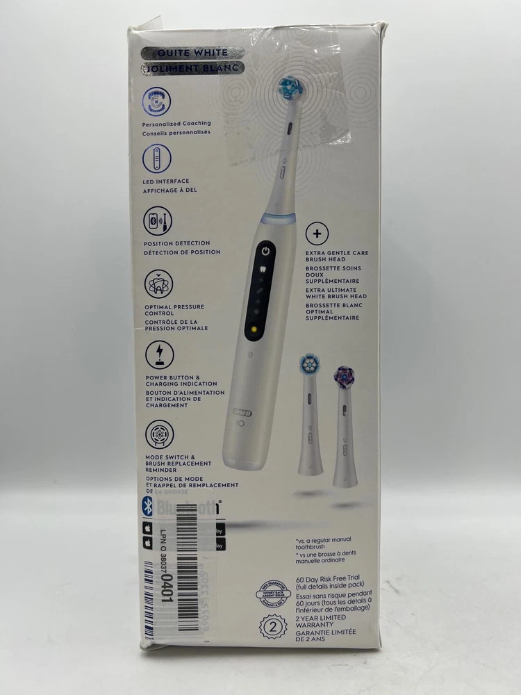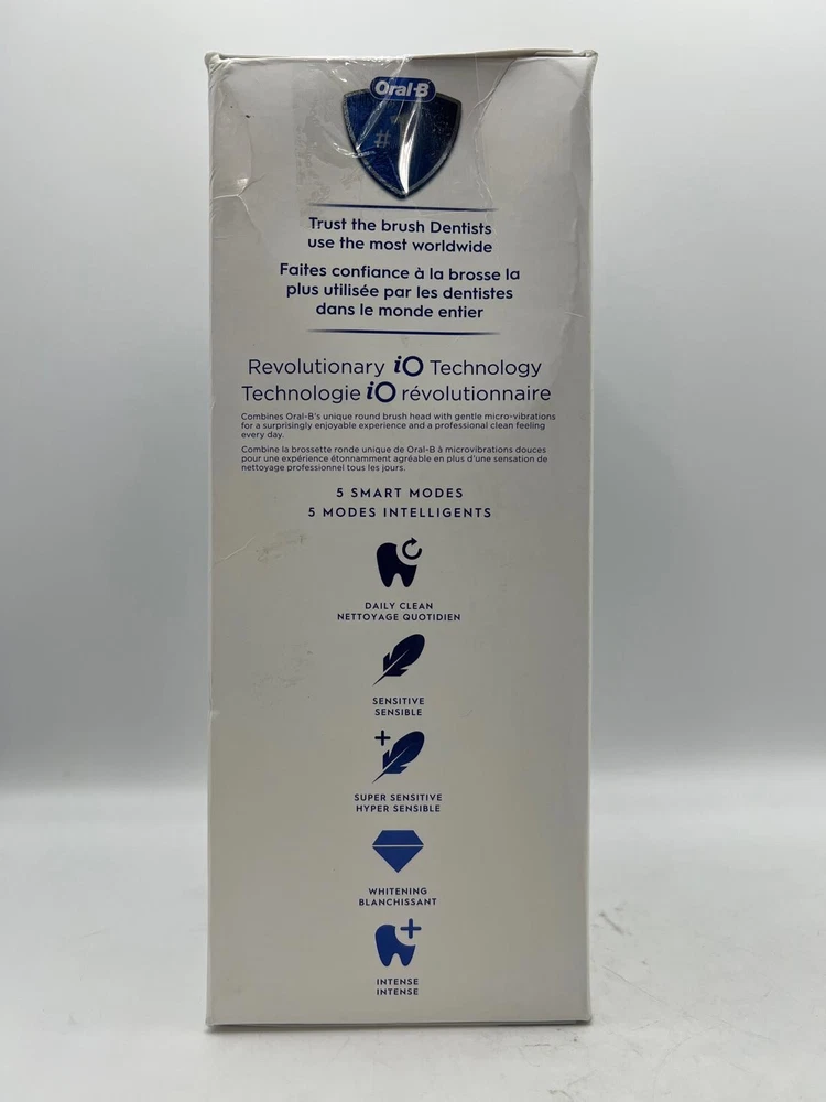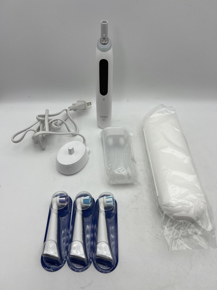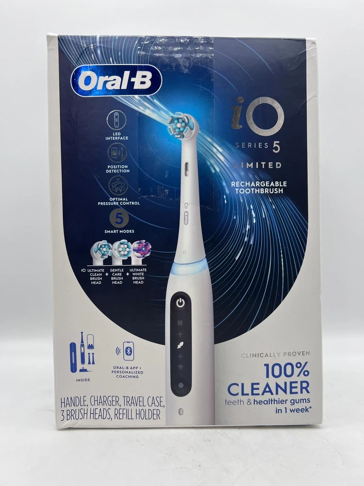 Condition: Open Box All pieces are included and function properly. This is a Grade A, open box product. Get noticeably cleaner teeth and healthier gums with the Oral-B iO Deep Clean + Whiten Electric Toothbrush. This model uses smart pressure sensor technology and five cleaning modes. It is designed to remove more plaque than manual brushes. The sensor ensures you use the right pressure for every session. This protects your gums while giving a thorough clean. If you want good oral health fast, this tool delivers results within one week of use.The Oral-B iO Deep Clean + Whiten Electric Toothbrush stands out for its round, dentist-inspired brush head and micro-vibrations. It cleans deep along the gumline and hard-to-reach places. The visible pressure sensor lights up green when you brush with the right touch and red when you press too hard. The built-in timer and 30-second quadrant pacing help you cover your whole mouth. Choose from five modes: Daily Clean, Gum Care, Whitening, Sensitive, and Intense Clean. Each setting is easy to activate and caters to different needs.The package includes an iO5 Limited handle, three Oral-B brush heads, a lockable travel case, and a refill head holder. The travel case protects your toothbrush when you are away. The refill holder keeps new heads clean and easy to find. The slim, ergonomic handle fits comfortably in your hand for long brushing sessions. A magnetic charging base fully powers the brush in about three hours. The battery lasts up to two weeks between charges, making it great for travel or home use.Advanced technology is a major feature in this model. The AI system works with the Oral-B mobile app. Bluetooth tracks your brushing style in real time. The app shows which areas are missed and gives daily tips to improve your habits. This feedback helps prevent problems such as cavities or gum disease. In Whitening mode, powerful micro-vibrations gently lift stains for a brighter smile. Gum Care mode massages for improved gum health. Switch between Sensitive or Intense Clean for different comfort levels.Easy maintenance keeps your electric toothbrush working its best. Swap out brush heads every three months. The handle is compatible with other Oral-B iO replacement heads if you prefer a different style. Use a soft cloth to wipe the handle and travel case. Store everything in the provided holders to keep it organized and sanitary. Following these tips ensures your brush stays effective and fresh every day.With advanced features and thoughtful design, the Oral-B iO Deep Clean + Whiten Electric Toothbrush is an excellent choice for anyone wanting to improve their oral health routine. It has the technology and accessories you need for thorough, comfortable brushing at home or on the go. The pressure sensor helps prevent over-brushing, while different modes help users target whitening, gum care, sensitivity, or deep cleaning.
