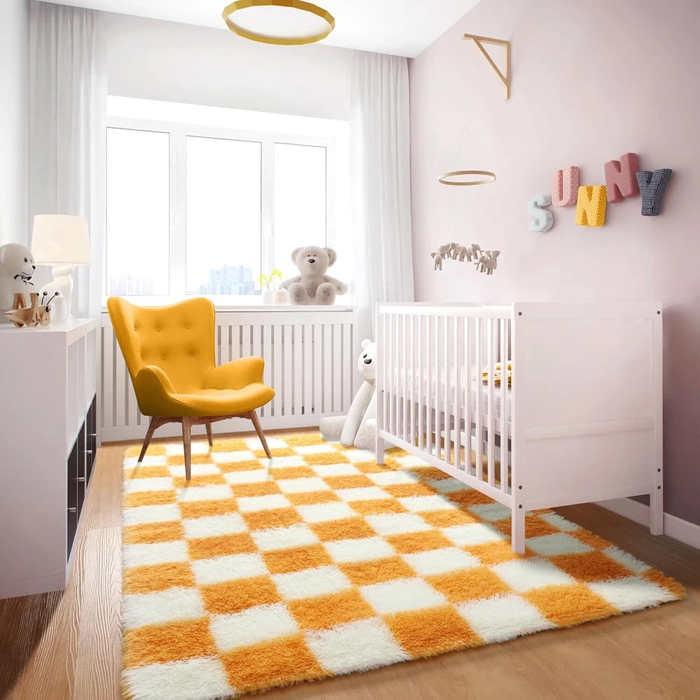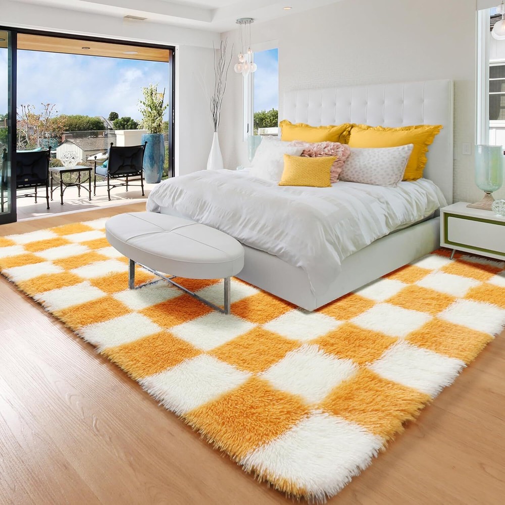 Modern Design -- KICMOR cream white and orange rug design is inspired by Checkerboard (date back to the 15th mid-century). It is a classic style that never goes out, suitable for creating aesthetic and elevate your space, enhancing your living room, bedroom, or dorm. Ultra Soft Fluffy Rugs -- Feels like stepping on a fuzzy cloud! Our shag rug is made of microfiber and spongy interlayer, and the shaggy rug surface is covered with billions of 1.6" plush fibers pile, which can provide a warmth on the cold floor and feels comfortable when walking barefoot. Suitable for creating a comfy area for kids, family and pets. Non-slip Bottom -- The thickened felt bottom with 40000+ high-density small and strong anti-slip dots, which can enhance the friction between the plush rug and the floor to prevent it from sliding. The tight weaving process ensures that the fuzzy rug is not easy to fall apart, and the fluffy carpet back is not easy to damage the floor. Easy to Clean Plush Area Rug -- Wipe the cozy rug with rag or clean it with a low-power vacuum, or shake outside, or hand wash the shag area rug with cold water or mild-cleaner, and place it in a ventilated place to air-dry. Please Note: Do not wash the soft rug by machine, bleach, tumble dry, or iron. Because of vacuum packaging, there will be some creases and not fluffy enough when you first open it, lay it flat for 2 to 3 days and it will be recover fluffy. Eye-Catching Home Decor -- KICMOR orange and cream white rug can add a pop of color and pattern to the space, it's a stylish and bright addition to living room, bedroom, nursery, bedside, girls room, boys room, playroom, classroom, kids room, kids bedroom, girls bedroom, fireplace, baby room, closet, apartment, home offices, basement, game room, dorm room, library, reading nook, or home decorative. Product Care Instructions Clean with a low-power vacuum or wipe with rag, Hand wash with mild cleaner(Air-dry,Do not wash it by machine, bleach, tumble dry, or iron)