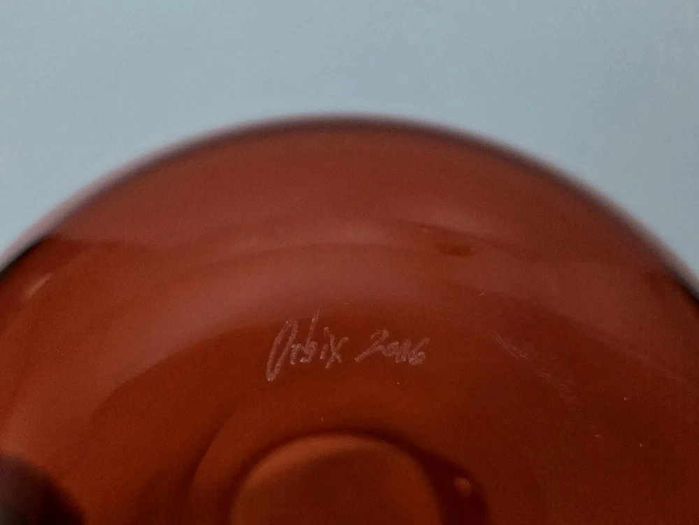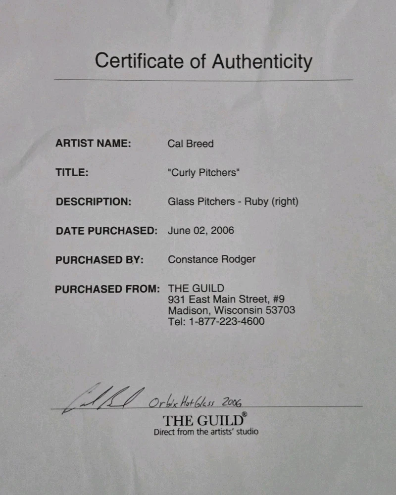 Orbix Hot Glass • “Curly Pitchers” Ruby Red • Handblown & Signed • Certificate of Authenticity Offered for your collection is a truly museum-worthy piece of artisan craftsmanship: a signed 2006 Orbix Hot Glass “Curly Pitcher” in deep ruby red, crafted by celebrated Southern glassblower Cal Breed. This vase comes with its original Certificate of Authenticity, issued by The Guild (Madison, WI), and signed by the artist himself. It confirms this exact piece was purchased directly from the Orbix studio in 2006 and is titled as part of the “Curly Pitchers” series. 🔹 Title/Series: Curly Pitchers – Ruby (right) 🔹 Artist: Cal Breed (Orbix Hot Glass) 🔹 Date: Signed 2006, COA included 🔹 Material: Handblown glass 🔹 Color: Ruby body with clear curly handle 🔹 Signature: Etched on base + COA from artist 🔹 Dimensions: [Insert accurate size—let me know!] 🔹 Condition: Excellent; no flaws noted 🔹 Provenance: Purchased June 2, 2006 via The Guild --- 💼 Bonus: Certificate of Authenticity Included This piece includes the original COA, signed by Cal Breed and detailing title, date, and purchase info. A perfect addition for serious collectors. --- 📦 Shipping: Double-boxed and professionally packed Includes full insurance, tracking, and signature confirmation