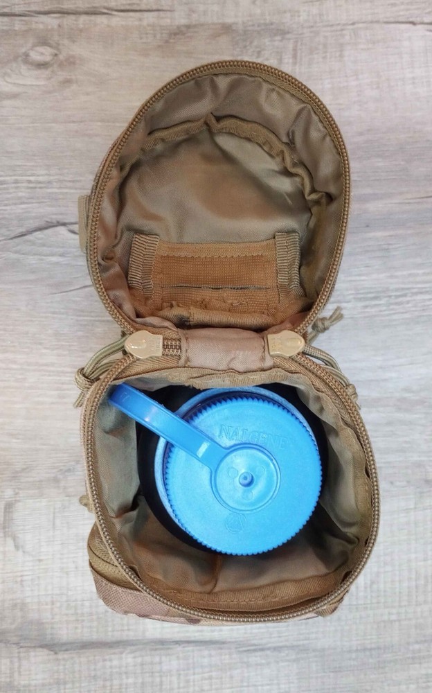 Approximate size: 12" x 6" Good condition. No notable damage or wear. Missing shoulder strap. Made of nylon Cordura, 600D. Orca Tactical , likely China, 2020's. Nalgene NOT INCLUDED.
