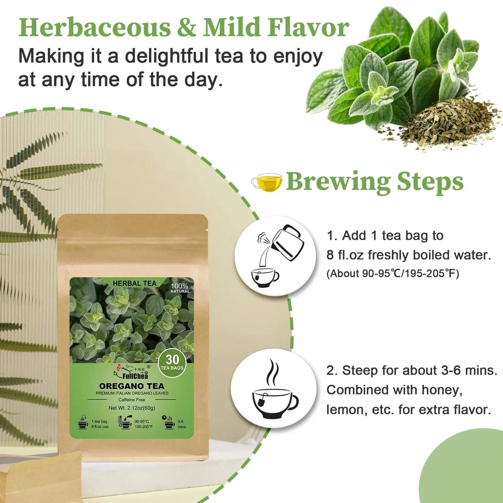 Pure & Reliable Choice: Our oregano tea is sourced from high-quality leaves, carefully selected and harvested for maximum freshness and flavor. No additives or fillers, just a cup of real tea from nature! Pure and Authentic Flavor: Oregano Tea is a harmonious blend of earthy, slightly bitter notes complemented by a subtle, herbaceous sweetness. Each sip is a journey to the sun-kissed hills where oregano thrives. Premium Tea Bags: We value the quality and safety of our tea bags. Therefore, we use high standardized food-grade materials and advanced glue-free ultrasonic bonding technology to make tea bags. You can enjoy every cup of our teabags with peace of mind. Convenient Enjoyment:Our resealable package is designed to provide convenience and freshness. Just 1 tea bag makes a delightful cup of oregano tea. Drink Tea At Ease: Sit back, relax, and savor the goodness of oregano tea. Whether you're looking for a comforting warm beverage or a refreshing iced tea, oregano tea is a versatile and enjoyable choice. Caffeine-Free Relaxation: As a caffeine-free beverage, oregano tea can be enjoyed any time of day for relaxation without disrupting sleep.