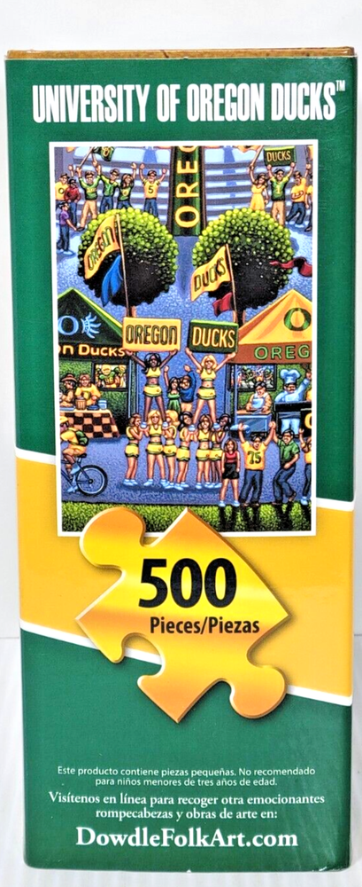 "University of Oregon Ducks" Folk Art - 500 Piece Jigsaw Puzzle University of Oregon treatment from Eric Dowdle. We did not work the puzzle or count the pieces, so we cannot guarantee that all pieces are present. Each item is carefully packaged to prevent any damage and is shipped immediately with tracking.