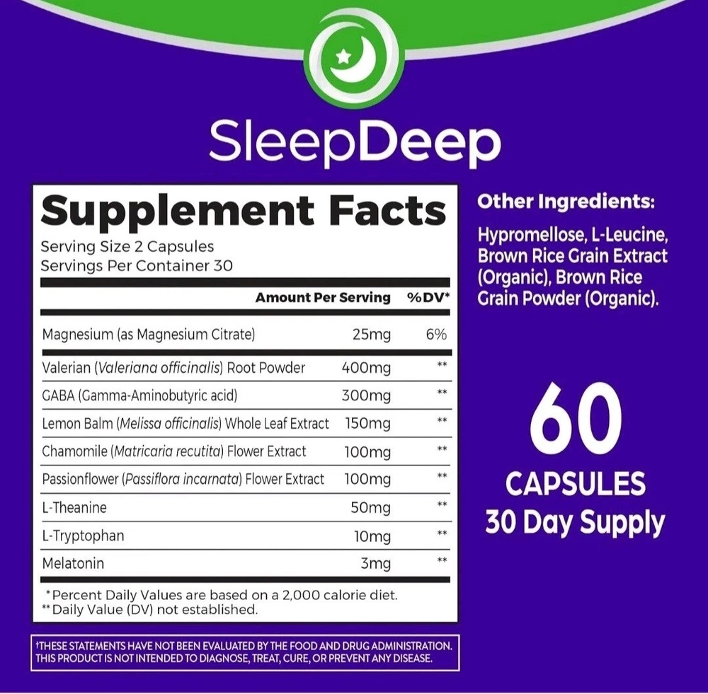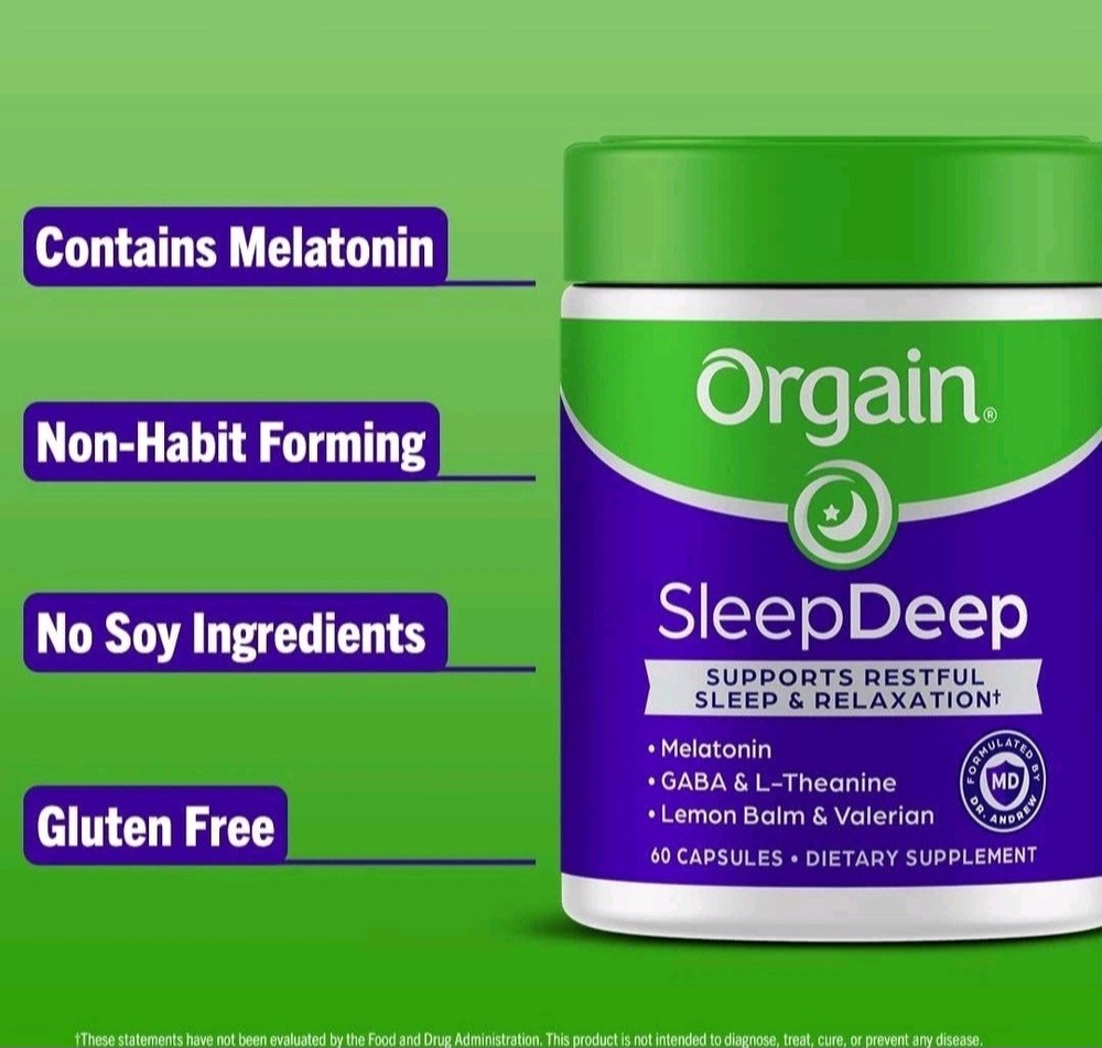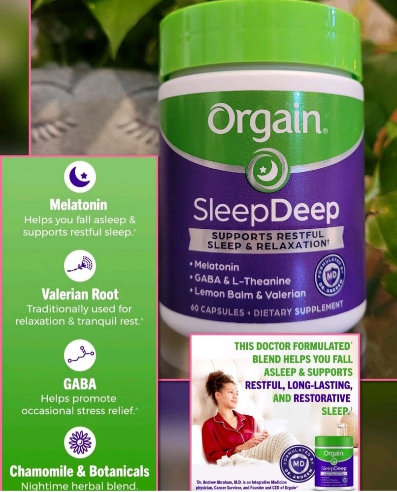 Orgain SleepDeep, Melatonin Sleep Aid Support Supplement with Magnesium, GABA, L-Theanine, L-Tryptophan, Chamomile, Lemon Balm & Valerian Root, Gluten Free, Doctor Formulated - 60 Count, 30 Day Supply About this item SUPPORTS RESTFUL SLEEP & RELAXATION^: Includes 3mg of melatonin, GABA, valerian root, L-theanine, L-Tryptophan & nighttime herbs like lemon balm, chamomile, passionflower, and magnesium. COUNT SHEEP, NOT THE HOURS: Snooze buttons, beware. Orgain’s SleepDeep includes Melatonin – a hormone created in our pineal gland that helps you fall asleep and supports restful, long-lasting, and restorative sleep^ QUALITY ASSURED: Drug Free and Non-Habit forming, Gluten free, No soy ingredients, doctor formulated*, No Artificial Flavors or Colors, Comprehensively tested for Quality, Made in NSF GMP registered facility DR. FORMULATED*: Thoughtfully formulated easy to swallow capsules by Orgain’s own Dr. Andrew Abraham* – an Integrative Medicine physician to support restful sleep & relaxation. SUGGESTED USE: For best results take 2 capsules with water or juice, 30 minutes prior to bedtime. Try with Orgain Stressless Supplement for additional benefits. WHAT TO EXPECT: Includes 1 (one) 60 capsule supply of Orgain SleepDeep supplements, equivalent to a 30-day supply