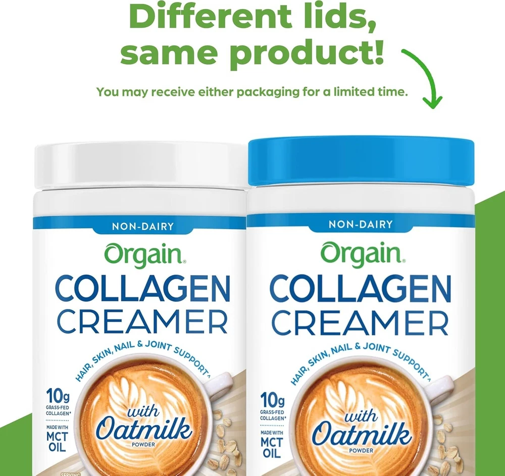 Orgain Collagen Coffee Creamer, 10g Grass Fed Hydrolyzed Collagen Peptides, Original - With Organic Oat Milk Powder, Coconut Oil, MCT Oil, Avocado Oil, Hair, Skin, Nail, & Joint Support - 10oz Includes 1 (10 oz) Orgain Original Collagen Creamer with Organic Oatmilk. Great for Coffee, Tea, Smoothies, or Baking. 10 grams of non-dairy collagen creamer made with organic oatmilk powder, organic coconut oil, and organic avocado oil, 1 gram of sugar, 80 calories per serving Made without soy, dairy, or gluten, Non-GMO, certified kosher, doctor developed Scoop, stir (or froth), and sip. Mix smooth, creamy collagen creamer into a morning cup of coffee or snack to elevate your daily glow Perfect for both men and women. Supports joint function and health, strong hair and nails, muscle recovery, and radiant skin. Boosts metabolism, improves digestion, and mixes easily in any food or drink.