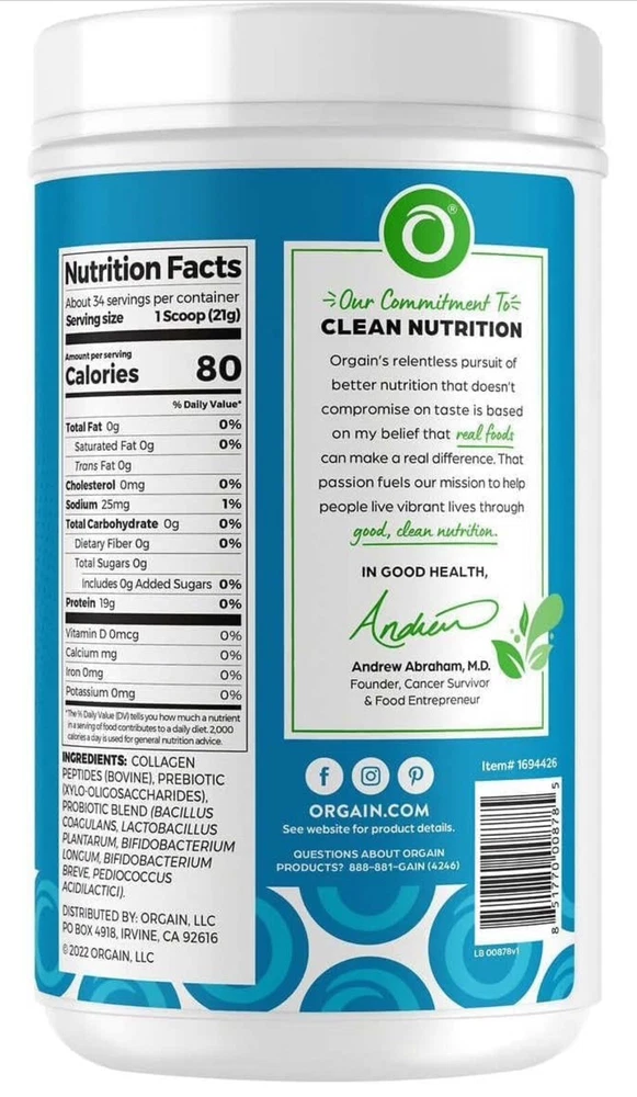 Orgain Collagen Peptides + Probiotics Grass Fed Unflavored,