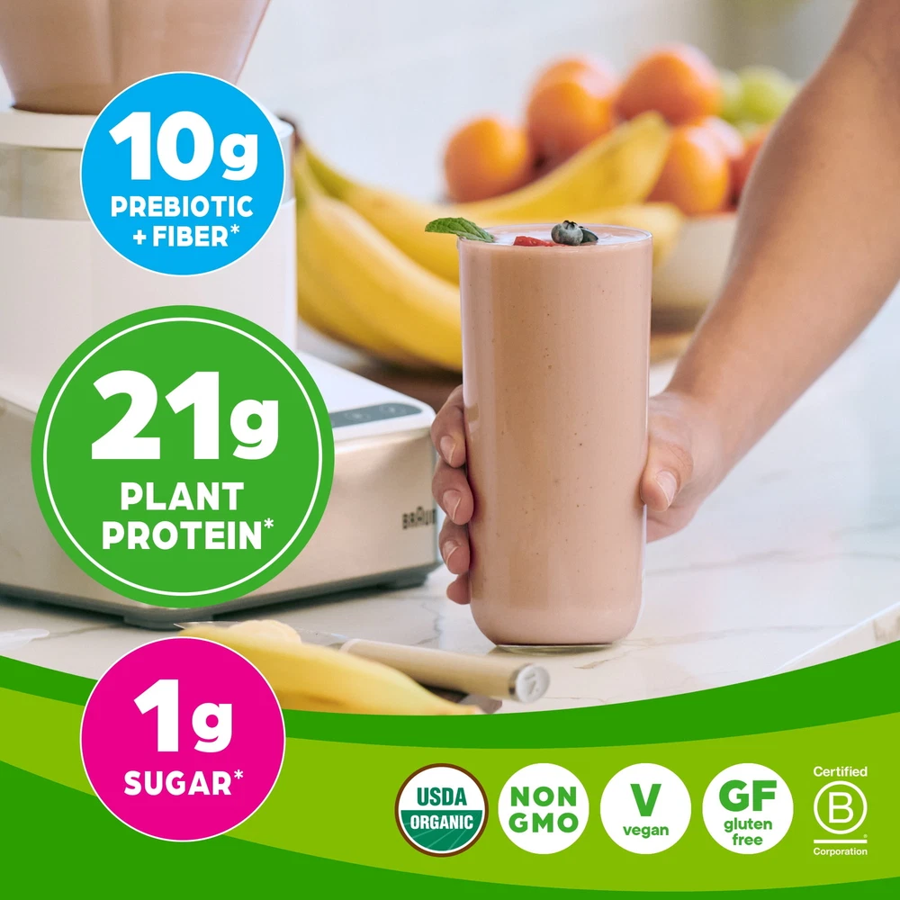 Product details What makes Orgain the #1 plant protein powder brand in the U.S.^? Is it the smooth and creamy flavor? The delicious taste without the grit? The fact that it serves up 21 grams* of organic, vegan protein optimized with 50 organic superfoods and an extra boost for maximum nutrition? Or that it's so easy to prepare? Truthfully, it's all of this and so much more. Our protein blend consists of organic peas, brown rice, and chia seeds, to provide a complete protein with all nine essential amino acids. Each serving contains 50 organic superfoods like kale, flax, broccoli, spinach, quinoa, beet, acai, and turmeric and is an excellent source of vitamin B6, vitamin C and iron to support your immune system. Not only does our plant-based protein powder serve up the tastiest, creamiest protein, but it's also made with uber clean ingredients and higher standards in mind! Enjoy a protein powder that's certified USDA organic, non-GMO, and made without soy, dairy, gluten, or artificial preservatives, sweeteners or flavors. On top of all of that, it boasts 10g* of prebiotic + fiber, 1g of sugar*, and has 160 calories*. Plus, when it comes to flavor and versatility, this powder delivers. Mix our plant-based protein powders with your favorite smoothies, almond or oat milk, and even baking mixes for to add a good, clean boost. At Orgain we celebrate taste, and we take it seriously because we recognize that part of living a vibrant life is loving what you eat. Go ahead, fuel up with the powder that's a treat for both your taste buds and your body so you can have energy to keep on going! ^Source: IRI, Total US MULO, Latest 52 weeks ending 10.08.23 *per serving, varies by flavor CLEANER INGREDIENTS: 21g plant protein and 1g sugar per serving. Our protein blend consists of organic peas, brown rice, and chia seeds, to provide a complete protein with all nine essential amino acids. It also features 10g of prebiotic + fiber* for gut support. HIGHER STANDARDS: We believe it’s what’s on the inside that matters most, and that includes what we left out. You also won’t find any GMOs, carrageenan, soy, gluten, or artificial colors, flavors, sweeteners, or preservative Organic 50 Superfoods Blend™: Each serving contains 50 organic superfoods like kale, flax, broccoli, spinach, quinoa, beet, acai, and turmeric and is an excellent source of vitamin B6, vitamin C and iron to support your immune system. USDA ORGANIC & CERTIFIED PLANT-BASED: To ensure we are delivering on high-quality products, we use third parties to verify that we are certified organic and certified plant based. PERFECT FOR ANY LIFESTYLE: This protein powder is perfect for men and women alike, whether you’re maintaining a healthy lifestyle, working out, looking to add more protein to your diet, or following a diet regimen. #1 PLANT PROTEIN POWDER BRAND: We are proud to be the #1 plant protein powder brand in the U.S.^.