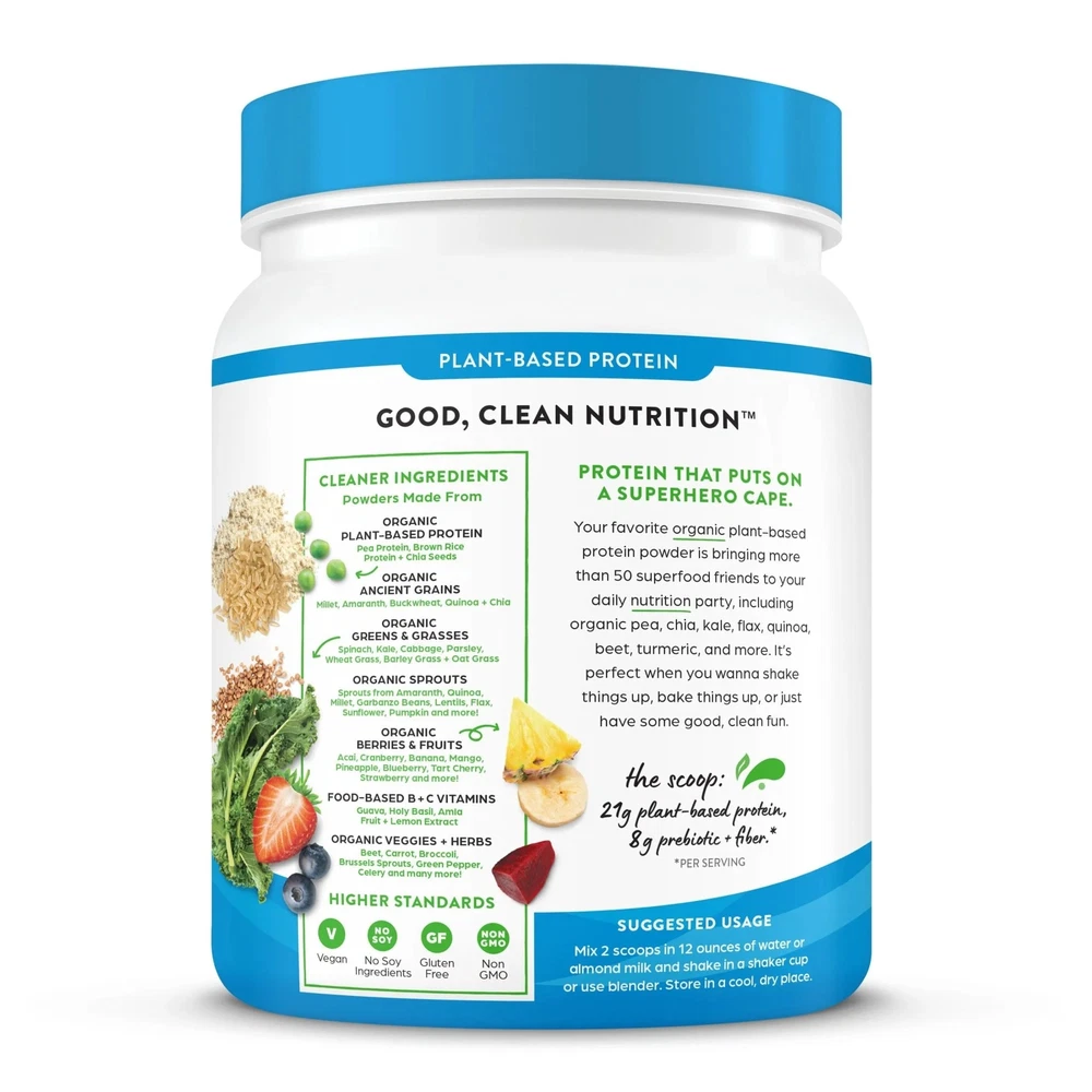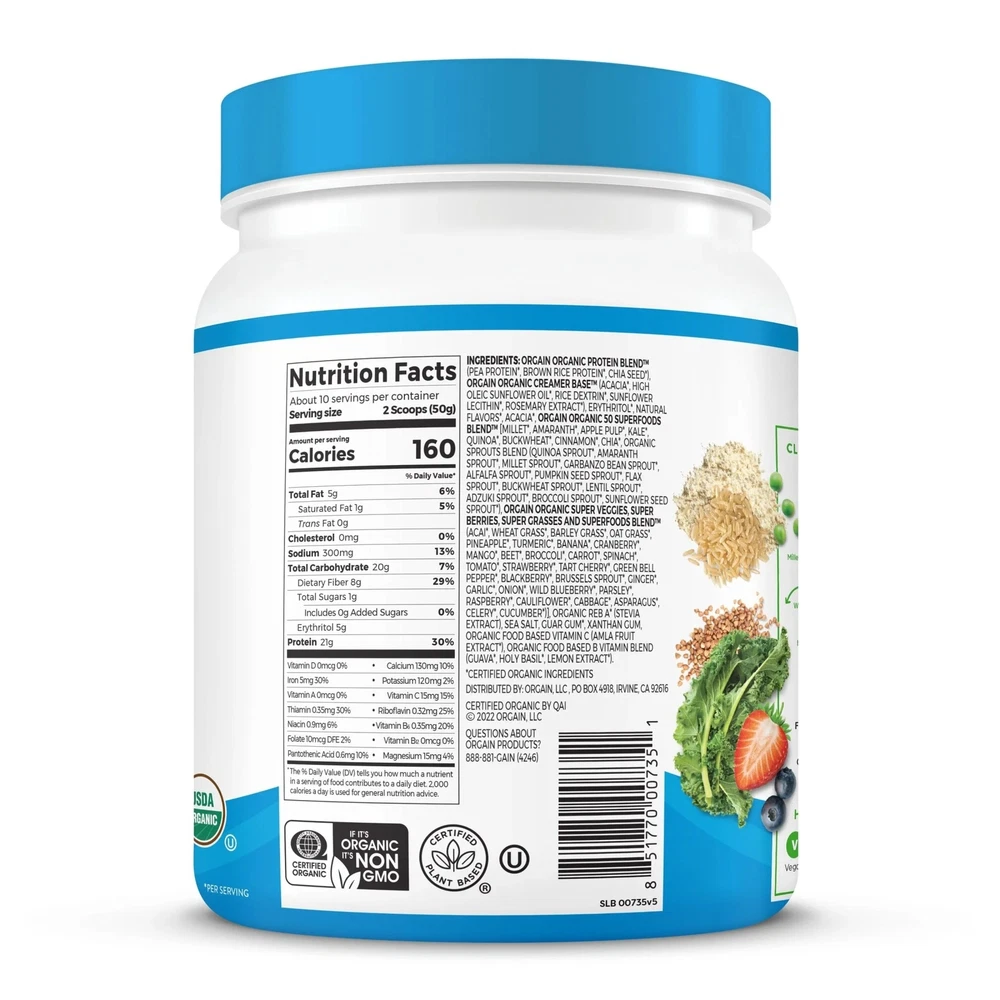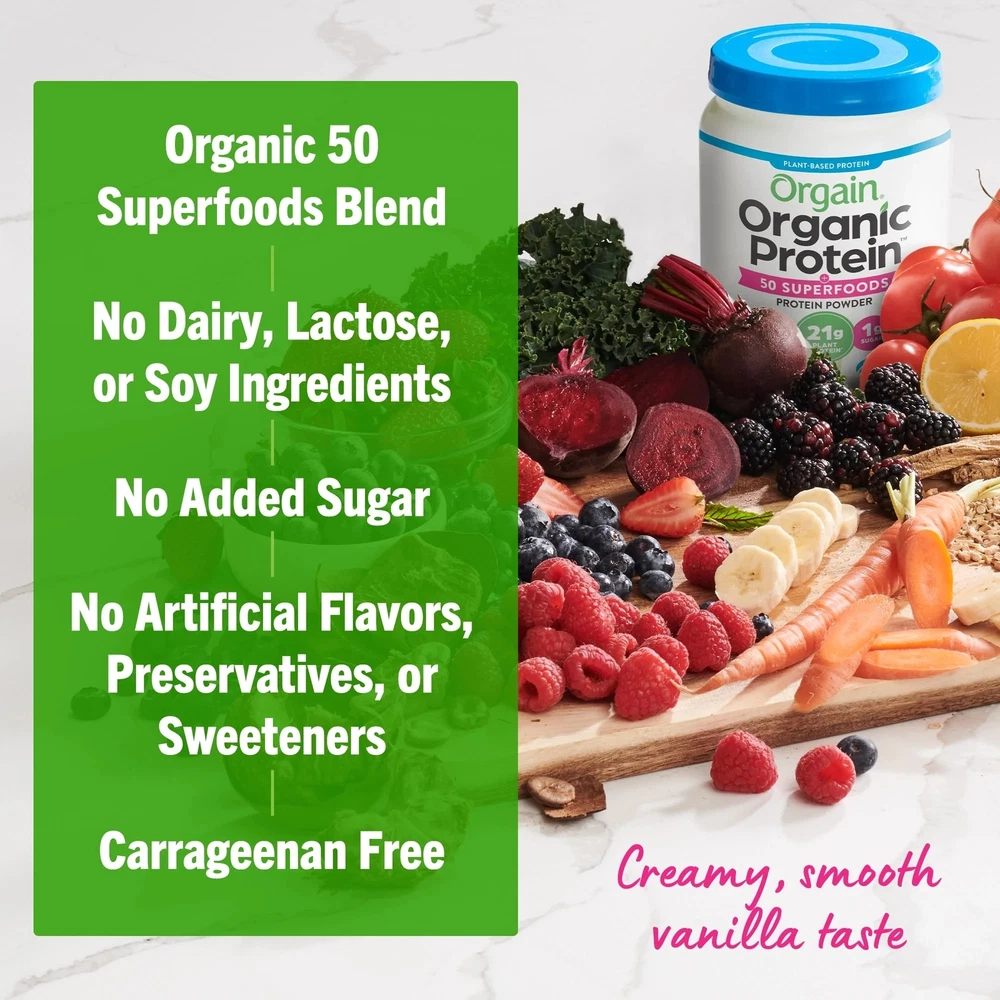 Product details What makes Orgain the #1 plant protein powder brand in the U.S.^? Is it the smooth and creamy flavor? The delicious taste without the grit? The fact that it serves up 21 grams* of organic, vegan protein optimized with 50 organic superfoods and an extra boost for maximum nutrition? Or that it's so easy to prepare? Truthfully, it's all of this and so much more. Our protein blend consists of organic peas, brown rice, and chia seeds, to provide a complete protein with all nine essential amino acids. Each serving contains 50 organic superfoods like kale, flax, broccoli, spinach, quinoa, beet, acai, and turmeric and is an excellent source of vitamin B6, vitamin C and iron to support your immune system. Not only does our plant-based protein powder serve up the tastiest, creamiest protein, but it's also made with uber clean ingredients and higher standards in mind! Enjoy a protein powder that's certified USDA organic, non-GMO, and made without soy, dairy, gluten, or artificial preservatives, sweeteners or flavors. On top of all of that, it boasts 8g* of prebiotic + fiber, 1g of sugar*, and has 160 calories*. Plus, when it comes to flavor and versatility, this powder delivers. Mix our plant-based protein powders with your favorite smoothies, almond or oat milk, and even baking mixes for to add a good, clean boost. At Orgain we celebrate taste, and we take it seriously because we recognize that part of living a vibrant life is loving what you eat. Go ahead, fuel up with the powder that's a treat for both your taste buds and your body so you can have energy to keep on going! ^Source: IRI, Total US MULO, Latest 52 weeks ending 10.08.23 *per serving, varies by flavor CLEANER INGREDIENTS: 21g plant protein and 1g sugar per serving. Our protein blend consists of organic peas, brown rice, and chia seeds, to provide a complete protein with all nine essential amino acids. It also features 8g of prebiotic + fiber* for gut support. HIGHER STANDARDS: We believe it’s what’s on the inside that matters most, and that includes what we left out. You also won’t find any GMOs, carrageenan, soy, gluten, or artificial colors, flavors, sweeteners, or preservative Organic 50 Superfoods Blend™: Each serving contains 50 organic superfoods like kale, flax, broccoli, spinach, quinoa, beet, acai, and turmeric and is an excellent source of vitamin B6, vitamin C and iron to support your immune system. USDA ORGANIC & CERTIFIED PLANT-BASED: To ensure we are delivering on high-quality products, we use third parties to verify that we are certified organic and certified plant based. PERFECT FOR ANY LIFESTYLE: This protein powder is perfect for men and women alike, whether you’re maintaining a healthy lifestyle, working out, looking to add more protein to your diet, or following a diet regimen. #1 PLANT PROTEIN POWDER BRAND: We are proud to be the #1 plant protein powder brand in the U.S.^