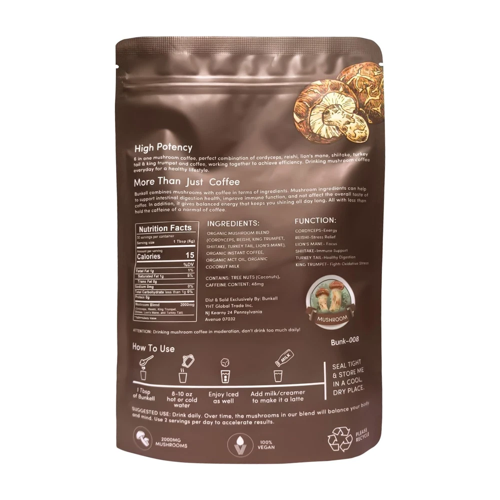 Six Mushrooms Coffee Blend: Mushroom coffee is maded by combining instant coffee with dried and finely ground mushrooms, features 6 premium mushrooms, includes Lion's Mane, Reishi, Cordyceps, Shiitake, King Trumpet & Turkey Tail, also plus MCT oil, coconut milk and organic Arabica coffee beans, better for focus & energy, digestion health and immune support. Enhance Immunity: Mushrooms and coffee beans contain compounds called polyphenols, because of their antioxidant properties, mushroom coffee can help strengthen one's immune health, block the damage caused by free radicals to us. More Healthier Coffee Alternative Drink: Mushroom Coffee! Known to have less caffeine than regular coffee, the amount of caffeine in Bunkell mushroom coffee is 48mg. Especially those sensitive to caffeine, it may improved your sleep quality friendly. Maintains gut health: Mushrooms are a good source of both fiber and prebiotics, the food for probiotics, both of which can help maintain gut health. Such as turkey tail, it has prebiotic properties that can promote intestinal health, improve digestive system function, gradually improve the gut microbiota environment and maintain a healthy state. Easy to Brew: The form of Bunkell mushroom coffee is instant mushroom coffee powder, just take 1 tsp(6g) coffee per 8-10 fl. oz, add creamer or milk according to your preference; If you like ice or hot coffee, also add ice cubes or brew it with hot water. The natural mushroom ingredients are very suitable for vegetarians.