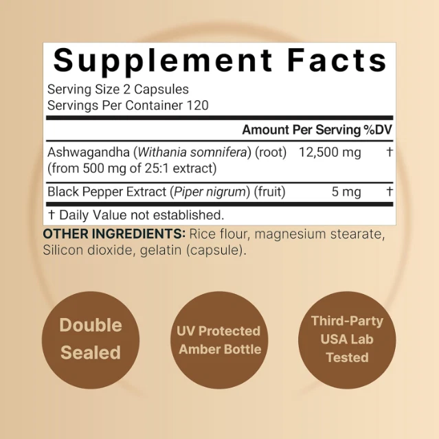 Organic Ashwagandha 12500MG W/Black Pepper Extract for Enhance US Warehouse - FREE & FAST Shipping in US Product Description: These statements have not been evaluated by the FDA. This product is not intended to diagnose, treat, cure, or prevent any disease or health condition. Max potency 12,500 mg ashwagandha from a 25:1 root extract per serving, combined with black pepper extract for enhanced absorption and bioavailability. 240 capsules per bottle, 2 capsule serving size, delivering 12,500 mg ashwagandha combined with 5 mg black pepper per dose, 4-month supply. Plant-based adaptogen rich in antioxidants, flavonoids, and active withanolides, promotes calmness, relaxation, and immune support for both men and women. The addition of black pepper adds natural piperine, which helps better absorb and utilize ashwagandha’s full spectrum of nutrients. Authentic non-GMO ingredients that are free of wheat, soy, dairy, gluten, eggs, fish, shellfish, peanuts, and tree nuts. All products are also 3rd party lab tested for safety and potency. Feedback: 1.Any question for your order, please contact us in time, we will reply to you within 24 hours and give you a satisfactory answer. 2.If you are satisfied with our products and services, hope to take up your a little precious time to leave feedback reviews for our products.Thanks! 3.Your satisfaction is our effort. Welcome to order again! Have a great day! Our Policy: 100% Satisfaction Guarantee 20% of restocking fee will be charged for return item