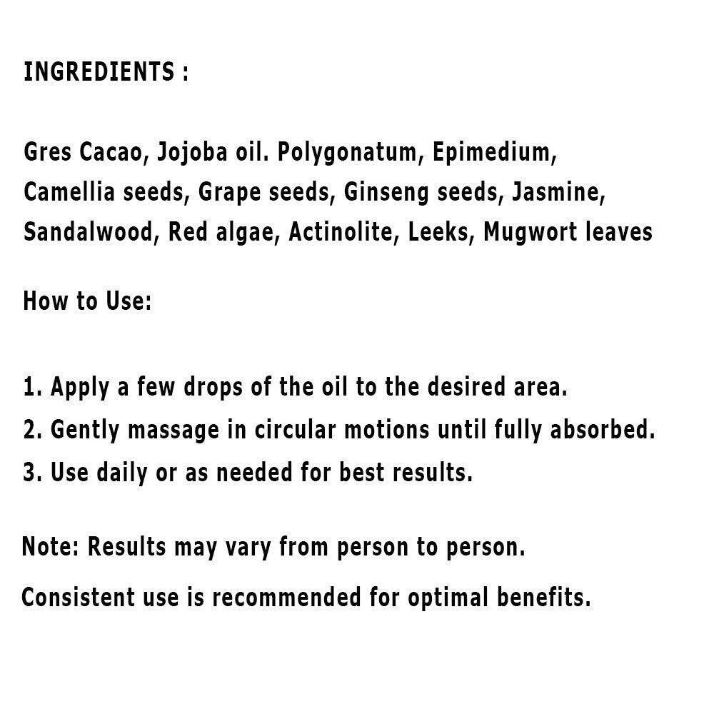 Gres Cacao Enhacement Massage Oil for Men - 1 fl oz ( Organic Formula Blend ) Ingredients: - Organic Formula Blend (Cacao Extract, Essential Oils, Herbal Extracts) How to Use: Apply a few drops of the oil to the desired area. Gently massage in circular motions until fully absorbed. Use daily or as needed for best results. Note: Results may vary from person to person. Consistent use is recommended for optimal benefits.