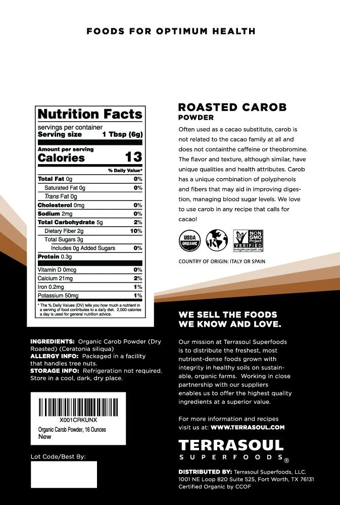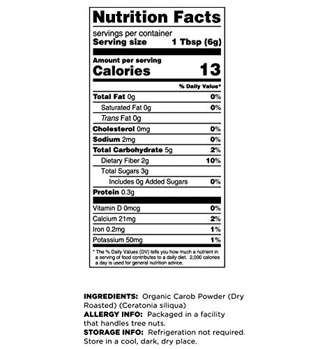 Often seen as a cacao substitute, carob is not related to the cacao family at all and does not contain the caffeine. The flavor and texture, although similar, have unique qualities and attributes. Carob has a unique combination of antioxidants and fibers that make it effective in improving digestion, managing blood sugar levels, and it may be beneficial to other more serious aliments. We love to use carob in any recipe that calls for cacao! Organic Carob , 16 ounces Certified Organic, Non-GMO, Earth , Gluten-Free, Vegan Lightly roasted to enhance its sweet chocolate flavor The pulp of the pod is sweet and rich. Use to replace Carob for cocoa or chocolate in your recipes for a no-fat, caffeine-free option. 100% Money-Back Satisfaction - We stand behind our products and offer a 30-day money back , backed by an outstanding team.