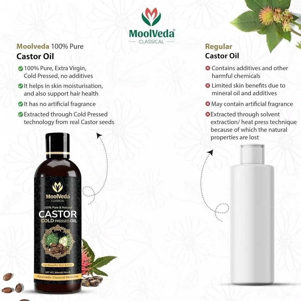 Premium Organic Castor Oil 100% Pure and Hexane-Free Cold-Pressed Beauty 6.7 fl oz (Pack of 1) Moolveda Pure Cold Pressed Castor Hair Oil For Hair Growth, Stronger Hair, Skin Care, Nails, 100% Pure & Natural, Moisturising Dry Skin, Nails, Eyelash, 200ml HAIR STRENGTHENING: Our castor oil strengthens hair roots, reducing breakage and improving overall hair strength and resilience. EYELASHES & EYEBROWS ENHANCEMENT: Moolveda Castor Oil is a natural and safe option for enhancing the thickness and appearance of eyelashes and eyebrows, providing beautifully framed eyes. SKIN NOURISHMENT AND HYDRATION: Rich in Vitamin E, our castor oil deeply moisturizes and nourishes the skin, leaving it soft, supple, and glowing. SAFETY OF USE: Moolveda Cold Pressed Castor Oil is a natural and chemical-free product, making it safe for all skin and hair types. However, perform a patch test before use, and avoid contact with eyes. If irritation occurs, discontinue use. CHEMICAL FREE BEAUTY: Moolveda Castor Oil is cold-pressed and chemical-free, making it a safe and multipurpose beauty elixir for skin and hair care. Note: This Product is designed to deliver optimal results, offering high-quality performance and satisfaction. Please note that individual experiences and outcomes may vary based on personal use, preferences, and unique circumstances. For best results, we recommend following the provided guidelines and ensuring the product is used as intended. Product result may vary for every individual.