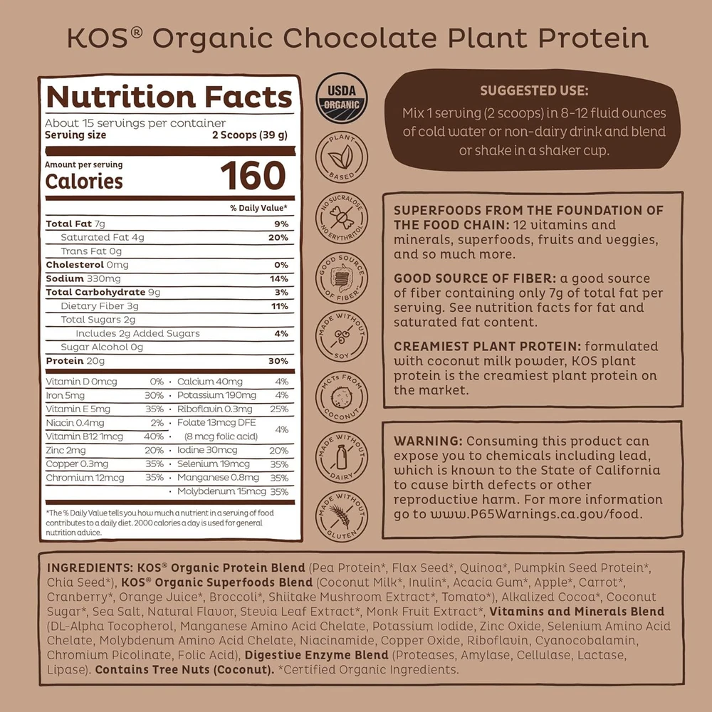 KOS Plant Based Protein Powder, Chocolate USDA Organic 20.6 Ounce (Pack of 1) Description Features: Amazing Flavor: Infused with organic Peruvian cacao, Sea salt, organic coconut milk, a dash of stevia & monk fruit, our award-winning protein blend is simply delicious! Add 2 scoops to cold water for tasty shakes or mix into smoothies & snacks. Weight Management Support: The soluble fiber in plant protein gives you that “full” feeling for a longer period of time. You eat less but not at the expense of calories. Still packed with 20g protein per serving and 12 Vitamins & Minerals. Digestion Support: Enhanced with powerful digestion support by Digestive Enzymes, a proprietary digestive enzyme blend. Digestive Enzymes aid digestion & help the body maximize absorption by embracing & capitalizing on its ingested nutrients. Responsibly Sourced: Nearly every ingredient is certified organic and free of gluten, dairy, soy, hormones, artificial sweeteners, colors, and GMOs. Made with USDA and CCOF certified ingredients. Product Details: Is Discontinued By Manufacturer : No Product Dimensions : 5 x 5 x 7 inches; 1.3 Pounds Item model number : KOS-VPP-CH15A Department : unisex-adult Manufacturer : Kos Brand: KOS Flavor: Chocolate Servings per Container: 15 Item Weight: 1.3 Pounds Material Type Free: Soy Free Handling We will ship all orders within 1 business day of payment. Delivery We Do Not Ship Outside of the Continental US. Return Policy All items qualify for returns within 30 days of receipt. Buyer is responsible for return shipping on any item that is not damaged. Feedback We take our reputation seriously, we buy and sell online, so we understand the value of trust. If you are unsatisfied with your order, please contact us and we will work with you to resolve it to your satisfaction.