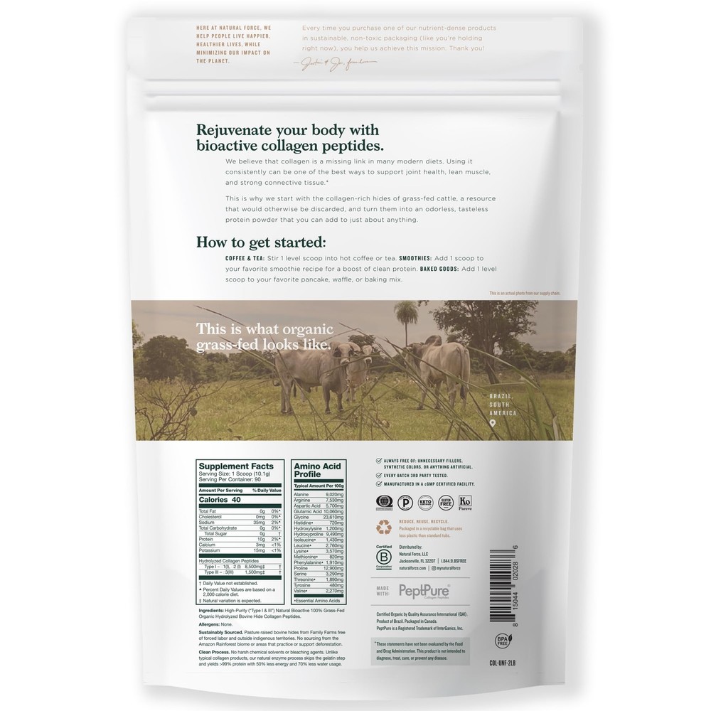 Collagen Peptides grass fed collagen protein is the highest quality hydrolyzed collagen protein on the market. It is a Collagen Type I responsibly sourced from South America. Our Collagen Hydrolysate contains key amino acids with high bioavailability and absorption. This paleo protein is an optimal choice for rebuilding and strengthening your muscles, joints, ligaments, tendons and bones. Not just that β it's also great for your skin and has tremendous anti-aging properties. Odorless and unflavored! Use in any beverage, hot or cold! Put a spoonful in shakes, add to your coffee, or use in cooking without affecting the taste or texture of the recipe. Benefits to Hydrolyzed Collagen Peptides: May increase athletic performance and maintain a lean body. Has been shown to reduce recovery time from physical activity and reduce risk of injuries. Can make you feel full to lose or maintain weight May promote youthful skin and improve skin moisture level. May prevent the formation of deep wrinkles. Could accelerate the growth of hair, skin, and nails as well as improve their structure. May improve joint comfort and flexibility. - Performance Fueled by Nature. USDA Certified Organic - Collagen Peptides are sustainably sourced exclusively from 100% grass-fed, pasture-raised cattle raised on Family Farms free of forced labor and located outside indigenous territories. They are never given antibiotics, hormones, or GMOs Only 1 Ingredient - High-Purity Type I and III Natural Bioactive 100% Grass-Fed Organic Hydrolyzed Bovine Hide Collagen Peptides. Each scoop of our pure Collagen Peptides provides 10g of clean protein, 18 Amino Acids (8 Essential), and has only 40 calories and 0g of fat and carbs. These organic peptides are less refined than conventional collagen and may have a more natural taste and consistency Clean Process - Our Collagen is certified Keto, Paleo, Kosher and always free of unnecessary fillers, harsh chemical solvents, synthetic colors, and anything artificial. Our natural enzyme process yields >99% protein with 50% less energy and 70% less water usage. We do not source from the Amazon Rainforest biome or areas that practice or support deforestation Daily Boost of Collagen Made Easy - Collagen Powder is hydrolyzed to make it easy to mix into coffees, teas, smoothies, baked goods, and more. Add one scoop a day to your favorite drink or recipe for a boost of collagen with plenty of long-term benefits including joint, hair, skin, and nail health Nutrition You Can Trust - Every batch of Collagen Peptides is 3rd party lab tested and independently analyzed for the presence of gluten, heavy metals, and other contaminated substances. And our packaging is always Eco-friendly!