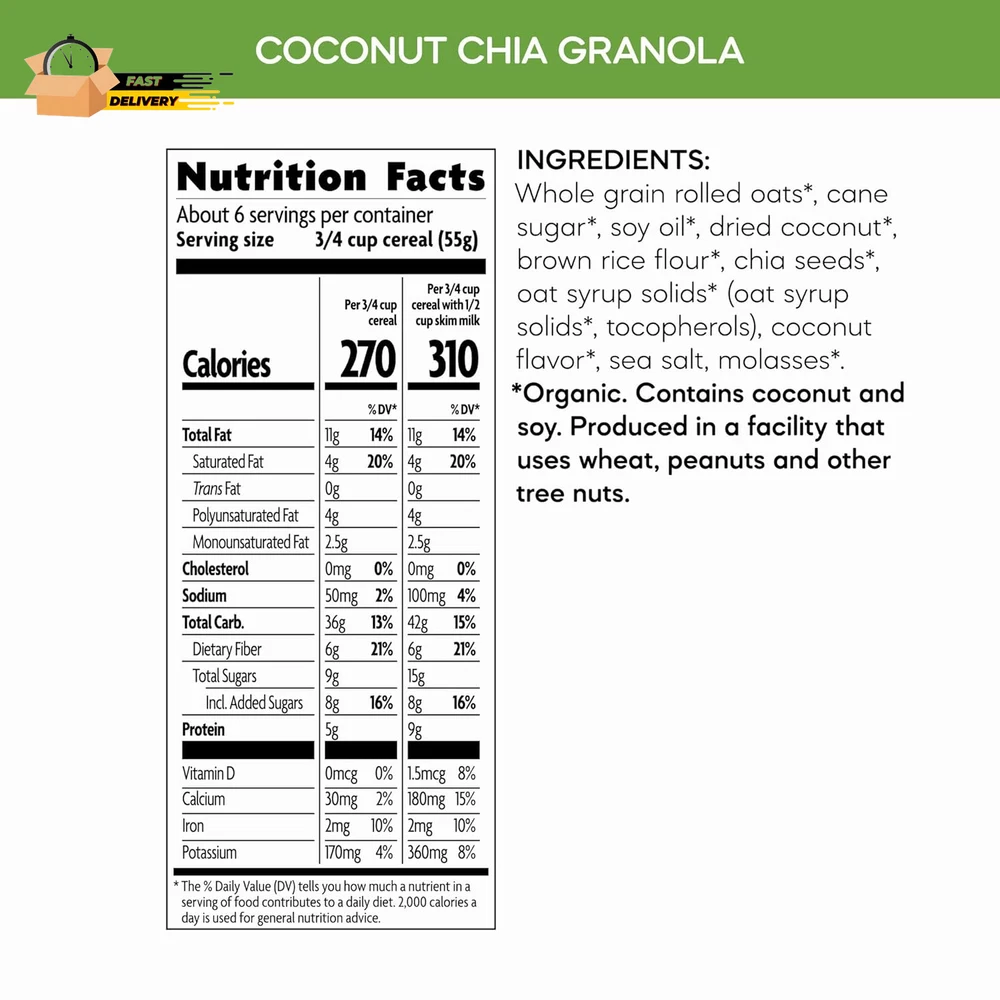 Store New Arrivals Add to Favorite View Feedback Contact Organic Coconut Chia Granola, 12.34 Ounce, Non GMO Description Item model number 89033 Age Range (Description) All Is Discontinued By Manufacturer No Product Dimensions 1.98 x 6.54 x 7.82 inches; 14.46 ounces Country of Origin USA Specialty Organic Flavor Name Coconut Chia Flavor Coconut Chia Item Form Flakes Size 12.34 Ounce (Pack of 1) Contains: 1 Box of Nature's Path Coconut Chia Granola, 12.34 ounces Organic whole grain oats, dried coconut, chia seeds, a hint of vanilla and a touch of natural sweetness come together in small clusters of deliciously crunchy granola. Whole grains add fiber to help support healthy digestion, chia seeds are a great way to get in plant based protein and omega-3 essential fatty acids for heart health. A perfect granola for vegan diets, it’s packed with 30g of whole grains, 5g of plant based protein, and 6g of fiber. Our planet, our food and our bodies are all connected. Being mindful about your food and choosing to eat organic means you’re making the best choice for your health, and our planet. Enjoy the satisfying crunch and the delicious taste of this Coconut Chia granola that features a rich blend of organic whole grain oats, dried coconut, chia seeds and a dash of sea salt. With each serving, your fueling your body with 9g of protein and 6g of fiber, but it’s the taste that will keep you reaching into the box. Doubling as a breakfast cereal or snack on the go, this Coconut Chia granola is the perfect choice for the health-conscious individual who craves great taste and wholesome ingredients. ABOUT US We offer the best prices around on high quality products. Our E-store includes media such as books, movies, music and games while offering electronics, toys, sporting apparel, clothing, tools, general home, garden items and more. SHIPPING We are always working hard to ensure your package arrives as soon as possible. Please understand that some factors like weather, high postal traffic, and the performance of shipping companies are outside of our control. We offer free shipping to the lower 48 states and ship within 2 business days of payment, usually sooner. We do not accept P.O. Boxes. Please provide a physical address. For shipping outside of the continental USA, we only use eBay's Global Shipping Program.The item is shipped to KY and then sent to the rest of the world. International customers are responsible for all duties and taxes. Continue to check out in order to calculate costs for shipping the item to your country. Messages regarding eBay's Global Shipping Program MUST be directed at eBay EXCLUSIVELY. RETURNS We offer a 30-Day Return Policy on items which you are not completely satisfied with. You have the option for a full-refund or an exchange of the item. No returns are available on items shipped outside of the USA. PAYMENT We accept PayPal. CONTACT US This page content is yet to come Please ad us to your favorite seller and visit again later Thank You CUSTOMER SATISFACTION We try our very best to make sure every customer is completely satisfied. If there's a problem, message us! We're happy to help. WE ACCEPT Copyright © 2021 AutoDS. | All Rights Reserved