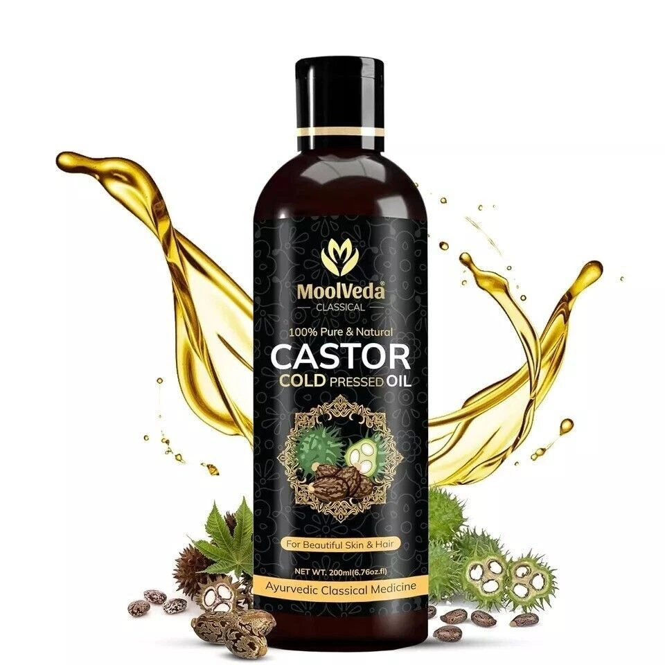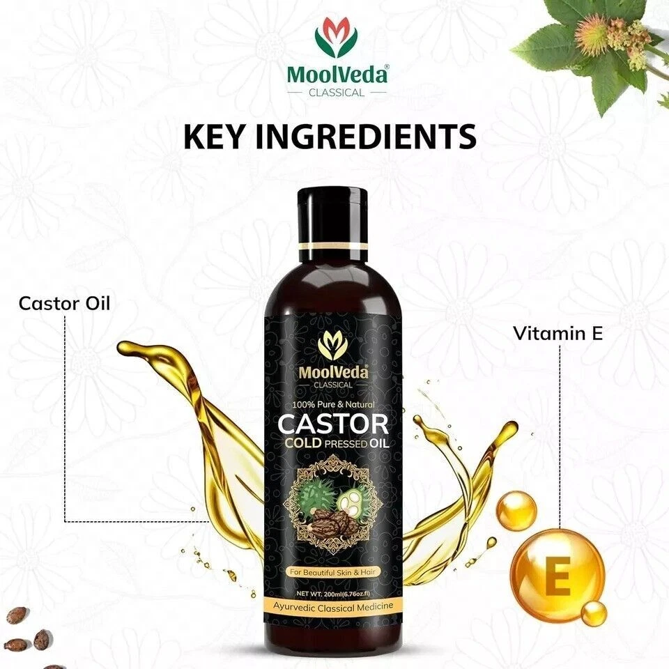Premium Organic Castor Oil 100% Pure and Hexane-Free Cold-Pressed Beauty 6.7 fl oz (Pack of 1) Moolveda Pure Cold Pressed Castor Hair Oil For Hair Growth, Stronger Hair, Skin Care, Nails, 100% Pure & Natural, Moisturising Dry Skin, Nails, Eyelash, 200ml HAIR STRENGTHENING: Our castor oil strengthens hair roots, reducing breakage and improving overall hair strength and resilience. EYELASHES & EYEBROWS ENHANCEMENT: Moolveda Castor Oil is a natural and safe option for enhancing the thickness and appearance of eyelashes and eyebrows, providing beautifully framed eyes. SKIN NOURISHMENT AND HYDRATION: Rich in Vitamin E, our castor oil deeply moisturizes and nourishes the skin, leaving it soft, supple, and glowing. SAFETY OF USE: Moolveda Cold Pressed Castor Oil is a natural and chemical-free product, making it safe for all skin and hair types. However, perform a patch test before use, and avoid contact with eyes. If irritation occurs, discontinue use. CHEMICAL FREE BEAUTY: Moolveda Castor Oil is cold-pressed and chemical-free, making it a safe and multipurpose beauty elixir for skin and hair care. Note: This Product is designed to deliver optimal results, offering high-quality performance and satisfaction. Please note that individual experiences and outcomes may vary based on personal use, preferences, and unique circumstances. For best results, we recommend following the provided guidelines and ensuring the product is used as intended. Product result may vary for every individual.