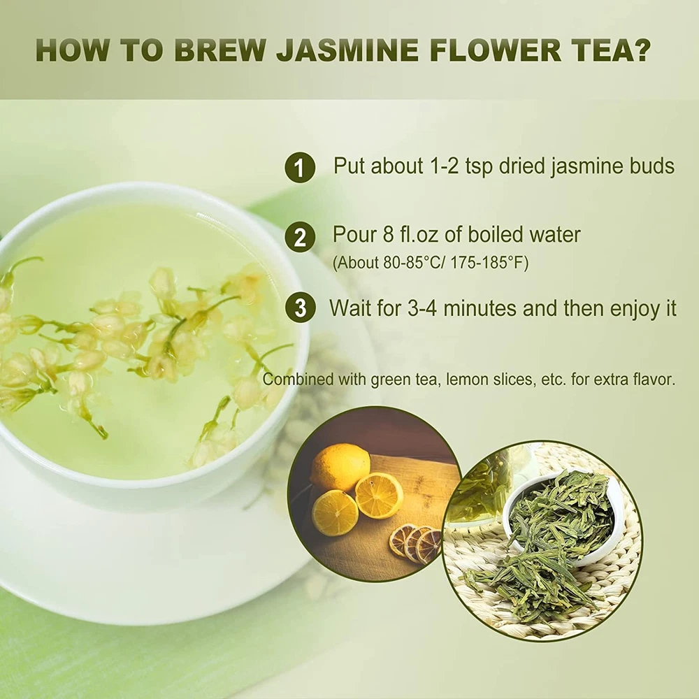 Item Form: Loose Leaves Flavor: Jasmine Flower Unit Count: 3.0 Ounce 【Manual Screening】Our jasmine flowers are 100% natural whole dried jasmine buds harvested in their adolescent stage. We adopted manual screening to remove the most inferior jasmine buds. You can get the purest jasmine flowers to meet your demands. 【100% Premium Food Grade】These culinary-grade jasmine flowers are proc essed according to the highest standard of food. Dried Jasmine buds typically smell different from fresh jasmine flowers, as the herbs lose their scent during drying. There is no any artificia l additive or chemical in our jasmine flowers. 【Herbal Tea For Your Health】With mildly sweet flavor and aromatic fragrance, jasmine can improve your mood and bring you deep relaxation. What’s more, Jasmine flower is particularly high in antioxidants, which can strengthen the immune system and support your wellness. 【Brewing Whenever and Whereve r】Jasmine tea is a drink that can be taken at any time of the day and can be enjoyed hot or cold. A cup of delicious jasmine tea after waking up or after work, in office or in friends' party, will refresh you. 【Various Wonderful Uses】Dried jasmine flowers are not only perfect for drinking but also a great addition to any green and white tea. In addition, they can be used for making soap, skincare, bath, cooking and so on. Enjoy the unique and gentle aroma of jasmine! Looking for some healthy flowers to drink or DIY products? Delicate and dainty with small flowers, jasmine is prized for its alluring, tropical scent and bee-drawing blossoms. Jasmine flower tea is also widely loved by people all over the world, which can be taken at any time of the day and it goes well with food and help to relax and refresh. How to brew a cup of delicious and healthy jasmine flower tea? Put about 1-2 tsp dried jasmine buds and then pour 8 fl.oz of boiled water (About 80-85°C/ 175-185°F). Wait for 3-4 minutes and then enjoy it! Add honey and sugar to taste if you have a sweet tooth. Combined with green tea, rose, lemon slices, etc. for extra flavor. Hope you will enjoy it! What benefits can Jasmine bring you? Improve Mood And Bring Deep Relaxation Need to rela x? Snatching a bit of leisure from a busy schedule, brew a cup of jasmine tea, then its smell can soothe you in no time. Offer Hair Benefits You may naturally treat your hair using jasmine flowers. Boil 20-25 jasmine flowers in water. Once cold, rinse your hair with it after sh ampooing, which can condition your hair deeply. Keep Fit Jasmine flower tea can strengthen the immune system and support your wellness. Just boil a few jasmine flowers in hot water along with some green/white tea leaves and include it in your diet, which aids in metabolism. Shipping Policy Payment Method Returns Policy Feedback Shipping Policy We endeavour to pack your orders carefully and ship our items within 24 hours after receiving your payment. We ship internationally on every day from Monday to Saturday to ensure prompt delivery. USA: 7-14 working days ( ePacket ) UK/ Canada: 14-21 working days ( China Post Air Mail ) Europe & Ireland: 18-24 working days ( China Post Air Mail ) Brazil/ South America: 25-35 working days ( China Post Air Mail ) Payment Method 1) We only accept PayPal ! 2) Payment must be made within 3 days of auction closing. 3) If you can't checkout immediately after auction close, please wait for a few minutes and retry. Returns Policy If you are not satisfied with your purchase (for items that are damaged or defective), for any reason, let us know. We will promptly replace the item or give you a refund. Feedback Your satisfaction and feedback are very important to us. Please leave positive feedback if you are satisfied with our item and service. If you have any problems with our item or service, please contact us first before you leaving any feedback. We will do our best to solve problem with you. Thank you for your understanding. Please contact us via eBay messages if you have any questions. You will get a response within 24 hours. Thanks for your support, best regards.