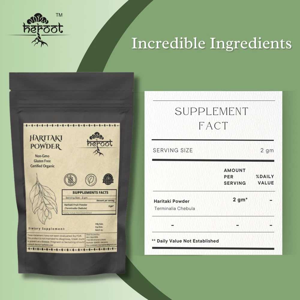 Heroot Organic Haritaki Powder Haritaki churna capsules is made from haritaki which is a clinically proven, time-tested remedy for all digestion-related problems. It aids digestion by increasing digestive enzymes, suppresses hyper acidity, improves absorption of nutrients, prevents constipation and piles. It also detoxifies your system from toxins. Haritaki has been taken from time immemorial for its holistic healing properties. Key Ingredients: Organic Haritaki Key Benefits: Provides relief from indigestion-related problems Exhibits antioxidant activity and improves liver function Helpful in constipation management Helps to treat bleeding and non-bleeding piles Relieves from stomach bloating and intestinal disorders Useful in spleen enlargement Directions For Use: Consume 1/4 tsp (3-5 gm) with lukewarm water after a meal Or as directed by your healthcare provider How To Consume: Can be mixed with warm milk & honey Can be taken with juices & smoothies Can be taken directly with honey Can be filled in capsule and consumed with water Safety Information: Store in a cool dry place Keep out of reach of children If you are pregnant or lactating or prone to any food allergy or under any medical condition consult your healthcare practitioner before use Disclaimer The above description is for information and knowledge purpose, not a healthcare professional advice. Please consult your doctor and/or pharmacist before you take this vitamin. Pregnant or lactating women, diabetics, hypoglycemics, and people with known medical conditions and/or taking drugs, should consult with a licensed physician and/or pharmacist prior to starting any supplementation program. The above statements have not been evaluated by the Food & Drug Administration. Shipping and Handling Shipping time will be 1 business day after the cleared payment We will ship by Indian Post service Shipment will take 15-30 days. Few more days for your local customs delay and formalities. For Express service additional charges will be applied. For any reason you wish to leave Negative or neutral feedback, Please contact us first and let us mutually resolve it. We care for your satisfaction and will make sure that you are happy with the transaction to post us 5**** ratings in all areas. ***Customs Information*** Heroot will not be liable for packages refused or held by customs for delivery. We request that you contact customs office and ask about import regulations and restrictions before placing your order. It is importsnt for you to become familiar with customs policies for your specific country before ordering. Customs regulations differ by country and not knowing their regulations can result in your order incurring high import duties, the delivery being delayed or even returned. Please check with your customs office to see if your country permits the shipment of the products you are planning to order from us and if any additional licenses or permits are needed. Please note: if your order is returned to us due to banned/ restricted products policy, a wrong address, refusal to pay customs fees, refusal to accept the order or because no one was there to accept the delivery of your order, we will refund your order as follow: you will be refunded the total amount of the order, minus the original shipping charge