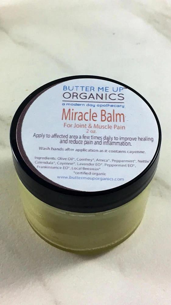 This salve uses the power of nature to relieve aching muscles and joints. Apply to affected area and enjoy the warming relief. Ingredients: olive oil*, arnica*, peppermint*, nettle*, comfrey*, calendula.*, lavender*, chamomile *, black seed*, beeswax*, cayenne* *indicates certified organic