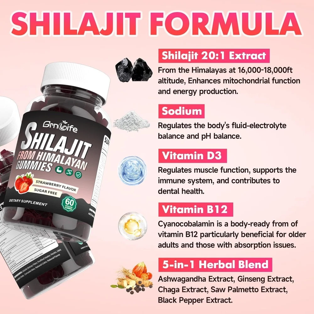 Shilajit Gummies for Men & Women, 1000MG Shilajit Supplement with 85+ Trace Minerals & Fulvic Acid for Energy, Immunity, Sugar-Free, Strawberry-60 Count PURE SHILAJIT GUMMIES: Our organic shilajit gummies for men & women, sourced from the untouched heights of 16,000-18,000 feet in the Himalayan mountains. Experience the potency and purity of this organic treasure, straight from the Himalayas, and balance the vitamins and minerals in your body. PURE SHILAJIT BENEFITS: This pure shilajit supplement contains a powerful blend of ingredients that help in boosting energy, cognitive health, boost metabolism, supercharge you with energy, stabilize your mood, and aid a healthy skin and hair. With our shilajit gummies, you'll not only boost your productivity, but you'll be able to enjoy a better life. 85+ TRACE MINERALS: Our Himalayan shilajit for men and women provides a rich source of over 85 trace minerals, including essential elements like selenium, copper, manganese, and more. These pure shilajit resin gummies are sugar-free and contain natural fulvic acid, providing excellent antioxidant support for your health. EASY TO CHEW & SUGAR-FREE: Our strawberry flavor pure shilajit gummies are sugar free (no cane sugar), Non GMO, vegan friendly. Includes organic ingredients, gluten free, allergen free and without unnecessary additives. EXCELLENT IN QUALITY: Grnlife shilajit gummies are GMP compliant and Lab-tested, all batches have quality assurance at every stage of production. We always strive to create the highest quality dietary supplements to be your partner in health.