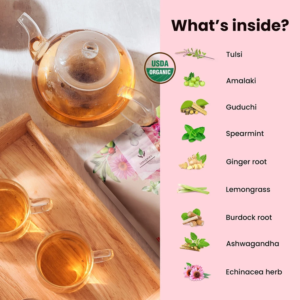 Immunity The key to a strong immune system is maintaining a balance of mind, body, and soul. And there is no better tea to keep all three in harmony than our Immunity tea! With all organic ingredients which are certified, Immunity loose leaf tea is the ideal means to attain mind, body, and spiritual balance par excellence. In this wondrous blend, the Amalaki herb plays the role of this tea’s main guru, sporting a rich level of antioxidants and C. Amalaki promotes better clarity and focus, emotional balance, digestion, physical strength, and better breathing. The Echinacea herb gently chimes in to harmonize our bodily rhythms by helping to dispel cold and flu-like symptoms. Burdock root is an ideal ingredient for those who feel a cold coming on or for those who just want to maintain their best possible. 100% CAFFEINE FREE TEA INGREDIENTS: Organic Amalaki, Organic Echinacea Herb, Organic Burdock Root, Organic Spearmint, Organic Ginger Root, Organic Tulsi, Organic Guduchi, Organic Lemongrass, and Organic Ashwagandha TASTE: Lemon-forward blend with a minty finish BREWING: Heat water just short of the boiling point 1-1.5 tsp per 6-8 oz water steep for 5-7 minutes sip and enjoy! VEGAN, CAFFEINE FREE, GLUTEN FREE, NO NATURAL OR ARTIFICIAL FLAVORS CAFFEINE FREE: Our blend is the answer if you seek an alternative to caffeine-heavy coffees and black teas. It is a tisane, meaning it has never contained any caffeine and is the perfect daily drink , whether consumed first thing in the morning or to wind down in the evening PURE ORGANIC TEA: We use only the finest quality, organic ingredients to create our pure tea blends NO ADDED ANYTHING: Crafted with no added sugars, artificial sweeteners, gluten, natural flavors, or artificial flavors LOOSE LEAF BENEFITS: Choosing to consume loose-leaf teas minimizes waste while maximizing taste. Our easy-resealable packages ensure each brew is as fresh as the last, and the flavor won't be compromised by wasteful tea bags INGREDIENTS: Organic Amalaki, Organic Echinacea Herb, Organic Burdock Root, Organic Spearmint, Organic Ginger Root, Organic Tulsi, Organic Guduchi, Organic Lemongrass, and Organic Ashwagandha TASTE: Lemon-forward blend with a minty finish COUNTRY OF ORIGIN: India