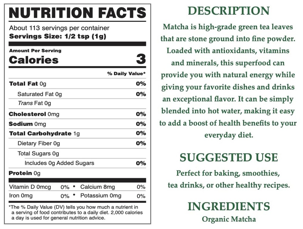 Chérie Sweet Heart Organic Matcha Powder - Matcha Green Tea Powder For Cooking, Baking, Latte, Smoothie, Hot & Iced Drinks - Antioxidant-Rich, Helps Support Digestive Health - No Gluten, Vegan 4oz Product Details Brand: Chérie Sweet Heart Item Form: Powder Flavor: Matcha Tea Variety: Green Unit Count: 4 Ounce Is Discontinued By Manufacturer : No Package Dimensions : 8.58 x 7.48 x 0.83 inches; 4 ounces UPC : Manufacturer : Chérie Sweet Heart Units : 4 Ounce Best Sellers Rank: #249,232 in Grocery & Gourmet Food (See Top 100 in Grocery & Gourmet Food) #964 in Matcha Tea #964 in Matcha Tea Customer Reviews: 4.1 4.1 out of 5 stars 34 ratings Promotes Focus & Energy - Matcha contains more caffeine per gram than regular green tea. Paired with the amino acid L-theanine, it may boost alertness and concentration without the jitters. Great For Digestion - Our organic matcha green tea powder is also rich in ECGC and catechins that help support digestion and good gut flora. Matcha has also been shown to stimulate metabolism. Bursting With Nutrients - Matcha can provide Vitamins A, B, C, E, and K, proteins and amino acids that aid in reducing stress, and a megadose of antioxidants that help your body fight cell damage. Makes Delicious Drinks - Culinary-grade matcha tea powder can be whisked in hot water to make green tea drinks, mixed into milkshakes and smoothies, or incorporated into lattes and cold brews. A Fine Powder For Baking - Our organic, gluten-free, and vegan-friendly green tea matcha will add an excellent green tea flavor to your baked goods. What's all the buzz about matcha green tea? More than just a passing trend, matcha has been part of Japanese and Chinese culture for hundreds of years. It's made of specially-grown tea leaves finely ground into a powder that makes a delicious, nutritious traditional drink. Though its characteristics can vary depending on harvest and processing, the unique color and flavor make matcha so fun to experiment and play with. Matcha powder also has more caffeine per gram than green tea, balanced by focus-boosting L-theanine. If you’re looking for a dose of energy without the crash, matcha green tea is the way to go. Incorporate matcha into your daily routine with Organic Matcha Powder from Cherie Sweet Heart! With every pouch, you’ll get high-quality, finely milled matcha powder completely free of fillers or artificial additives. You can whisk it in hot water to make flavorful matcha drinks or add it into your favorite vegan and gluten-free recipes. It’s rich in polyphenols, antioxidants, vitamins, and amino acids that help fight stress, support brain function, and spur metabolism. Culinary-grade matcha powder also has a rich flavor profile that helps it stand out against other ingredients. The taste and distinctive coloring make it an excellent addition to lattes, smoothies, milkshakes, and diet-friendly baked treats. Whether you enjoy it warm, iced, sweet, or milky, a cup of nutritious matcha will be an amazing way to start the day. Still need convincing? Here a more excellent reasons to love our organic matcha powder: - Certified organic - Gluten-free and vegan-friendly - Resealable pouches; store in a cool, dry place Drink matcha for cleaner, greener energy. Add Cherie Sweet Heart Organic Matcha Powder to your cart TODAY!
