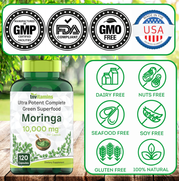 MORINGA Capsules Single Origin Moringa Powder Organic Moringa Leaf 120Capsules US Warehouse - FREE & FAST Shipping in US Product Description: These statements have not been evaluated by the FDA. This product is not intended to diagnose, treat, cure, or prevent any disease or health condition. Ultra Potent Moringa Capsules: 10,000mg Per Capsule! Four (4) Month Supply! Each Bottle Of Moringa Oleifera Leaf Powder Capsules Contains 120 Capsules, or a 4 Month Supply! Moringa Supplements Provide Powerful and Complete Supergreen and Superfood Nutritional Value! Moringa Powder Capsules May Help With Many Bodily Functions and Systems Due to Their Vitamin, and Mineral Content. Some Say That Moringa Powder Provides Energy,Boosts Metabolism, Immune Support, Digestion Support, as well as Joint, Bone, and Skin Support.* Moringa Capsules are Non-GMO! Our Moringa Powder Capsules are Both Manufactured and Third-Party Laboratory Tested in the USA! They are Free Of: Gluten, Peanuts, Tree Nuts, Sesame, Dairy (Milk and Eggs), Fish, Crustaceans, Soy, Wheat, Corn, Artificial Colors, Flavors, and Preservatives! Feedback: 1.Any question for your order, please contact us in time, we will reply to you within 24 hours and give you a satisfactory answer. 2.If you are satisfied with our products and services, hope to take up your a little precious time to leave feedback reviews for our products.Thanks! 3.Your satisfaction is our effort. Welcome to order again! Have a great day! Our Policy: 100% Satisfaction Guarantee 20% of restocking fee will be charged for return item