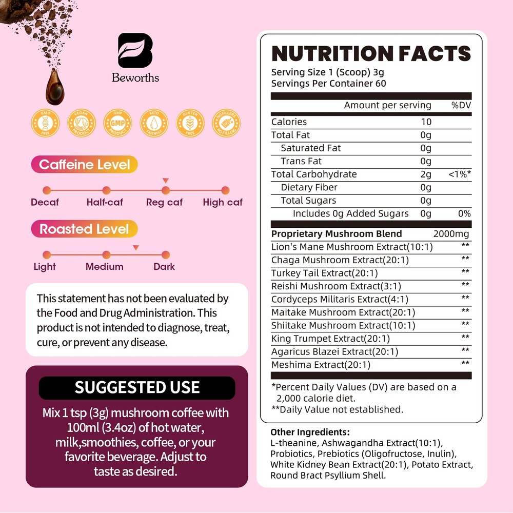Product Details Product Name: Mushroom Coffee Powder Net Content Options: 2g, 200g, 120g, 1000g Form: Powder Flavor: Rich coffee with a hint of mushroom aroma Category: Health Drinks, Coffee Alternatives, Immune Support Ingredient Amount Natural Arabica Coffee1650Lion's Mane Extract60Chaga Extract60Turkey Tail Mushroom Extract60Reishi Extract60Cordyceps Extract60Maitake Extract60Shiitake Extract60King Oyster Mushroom Extract60Agaricus Blazei Extract60Sanghuang Extract60L-Theanine120White Kidney Bean Extract240Potato Extract150Psyllium Husk150Inulin30Fructooligosaccharides (FOS)30Ashwagandha Extract30 Key Features 【Healthy & Nutritious Choice】Combines the energy boost of coffee with the immune-boosting benefits of mushrooms.Rich in antioxidants, polyphenols, and vitamins to support overall health. 【Great Taste & Aroma】Offers a deep, smooth coffee flavor with the unique earthy aroma of mushrooms.Perfect for those who want to explore layered and unique coffee experiences. 【Easy to Use】Simply brew the powder with hot water or your favorite beverage.Can be mixed with milk, plant-based milk, or sweeteners for customized flavors. 【Affordable & Versatile】Budget-friendly and suitable for daily use.Experiment with different brewing methods to create a variety of delicious drinks. 【Health Benefits】Supports heart health and helps lower cholesterol levels.Enhances immunity and boosts energy levels naturally.healthy addition to your daily routine. Ingredients Mushroom Extracts: Immune-boosting and nutrient-rich. Coffee Powder: Provides a natural energy boost. Natural Nutrients: Rich in antioxidants, polyphenols, and vitamins. Brewing Instructions: Add 1-2 teaspoons of mushroom coffee powder to a cup.Pour hot water (or milk) and stir well.Customize with sweeteners or flavors as desired. Recommended Serving: 1-2 cups per day for optimal benefits. Why Choose Our Mushroom Coffee? Natural & Organic: Made with high-quality ingredients for maximum health benefits. Energy & Immunity Boost: Combines the best of coffee and mushrooms for a balanced, healthy drink. Delicious & Convenient: Enjoy a unique flavor profile with the ease of instant coffee. Perfect For: Coffee lovers looking for a healthier alternative. Individuals seeking to boost their immunity and energy levels naturally. Anyone wanting to explore unique and flavorful coffee options. Contact Us & Feedback Your feedback is very important to us. We will leave positive feedback for you as soon as payment is received and hope you will take a moment to do the same for us. If u are satisfied with the item, please be kind to leave us positive feedback and a good rating. If you are not satisfied with the item or you have not received your parcel in the estimated time, we sincerely request from you contact us through the "My Message" section Or "Ask Seller Questions" BEFORE taking critical action. We will try our best to solve the problems to make our customers satisfied. All emails will be cos within 2 business day. If you do not receive our reply, please kindly re-sent your emails and we will reply to you ASAP. Payment The only acceptable payment methods are Payoneer, Credit Debit card & Paypal. Before your payments, please make sure you have a valid/active account. Our shipping services are valid only for verified eBay addresses. Therefore, please make sure to verify your eBay address. Moreover, your verified eBay address and the Paypal registered addresses are should be the same. Shipping We will ship the product about 2-3 days on confirmation of payment. The shipping method is Standard Registered Parcel Post. It includes 100% free shipping for most of our products. Nevertheless, this free shipping method might be changed for heavyweight items because of the huge amount of shipping cost. Returns 100% Satisfaction Guaranteed. We accept product returns within 30 business days from the delivery of the item. If you are not satisfied with the item or its condition, please feel free to contact us before taking action. We will try to solve any dispute and try our best to make our customers fully satisfied.