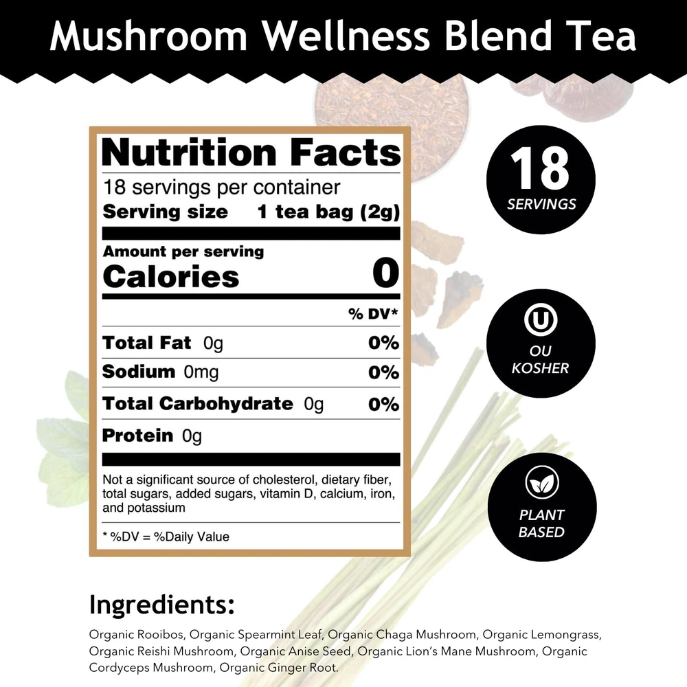 Organic Mushroom Wellness Blend Tea - Rich Source of Antioxidants | Kosher| 18 Bleach-Free Tea Bags MUSHROOM WELLNESS BLEND TEA - Our Mushroom Wellness Blend Tea contains four powerful tonic mushrooms - chaga, reishi, lion’s mane and cordyceps - providing a balanced, nutrient-dense tea to enjoy any time of day. UNIQUE TASTE - This tea has aromatic spearmint leaf, lemongrass, rooibos, and a touch of anise resulting in a uniquely delightful flavor you’ll love. You don’t need to hold your nose drinking this tea, the added beneficial flavorful herbs bring a taste you’ll come to crave. NO CAFFEINE - Our Mushroom Wellness Blend Tea is caffeine free, certified organic and free of any additives and flavoring. This tea has no artificial sweeteners and is only made with natural ingredients. QUALITY - At , our Mushroom Wellness Blend Tea is a revolutionary blend of mushrooms, with flavorful herbs and spices, bringing power and pleasure to your cup. This balanced, nutrient dense tea is perfect for any time of day. This tea is an important addition to any tea collector's cupboard. - believes that a proper cup of tea provides a nourishing experience that satisfies the soul while pleasing the senses. We strive to deliver a delightful and vast array of additive-free options, which includes herbal, green, white, and black teas, as well as uniquely crafted blends, made from the freshest herbs and tea leaves.