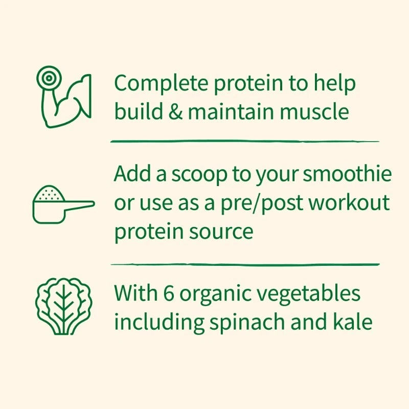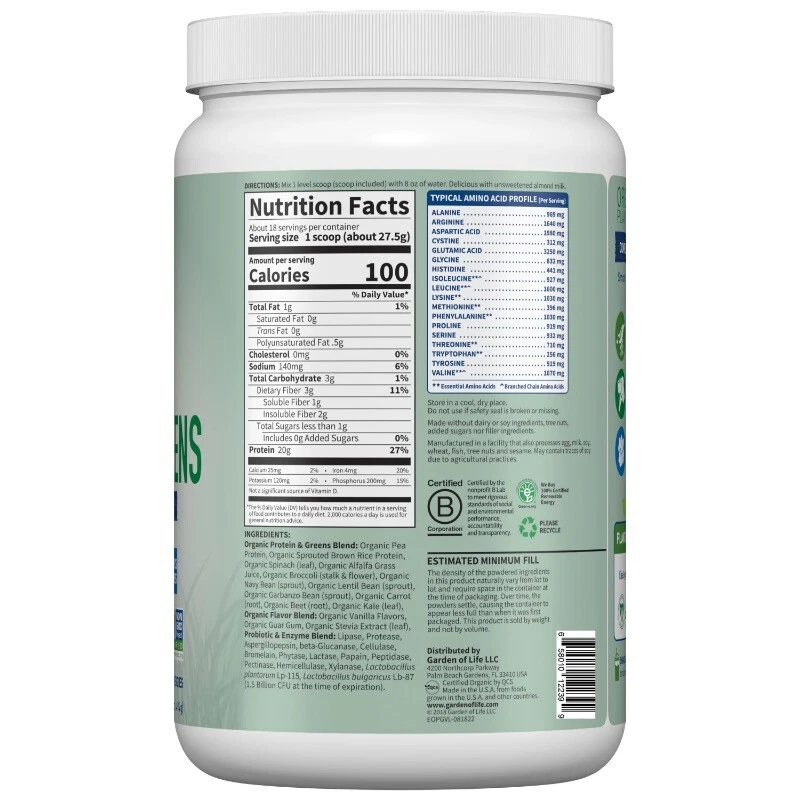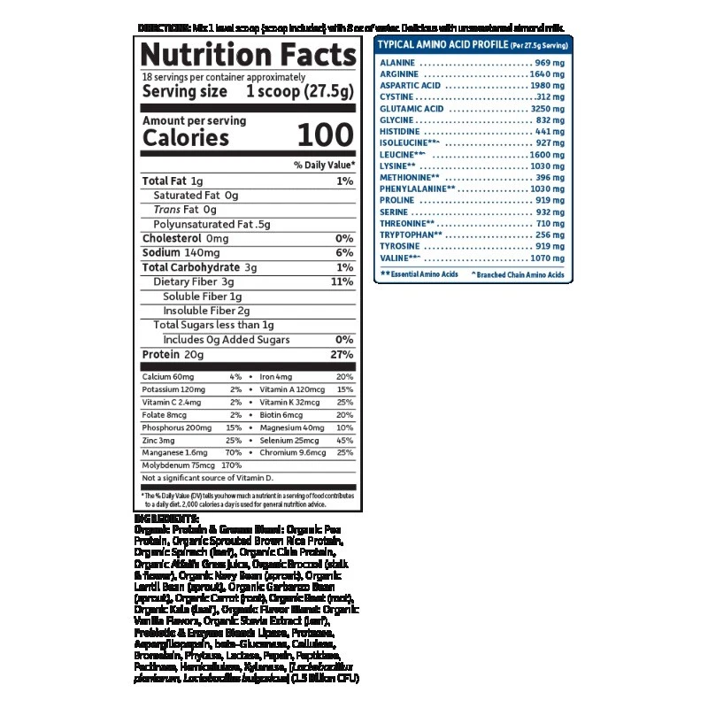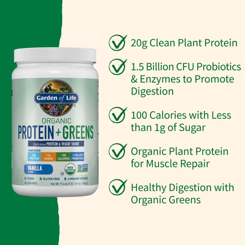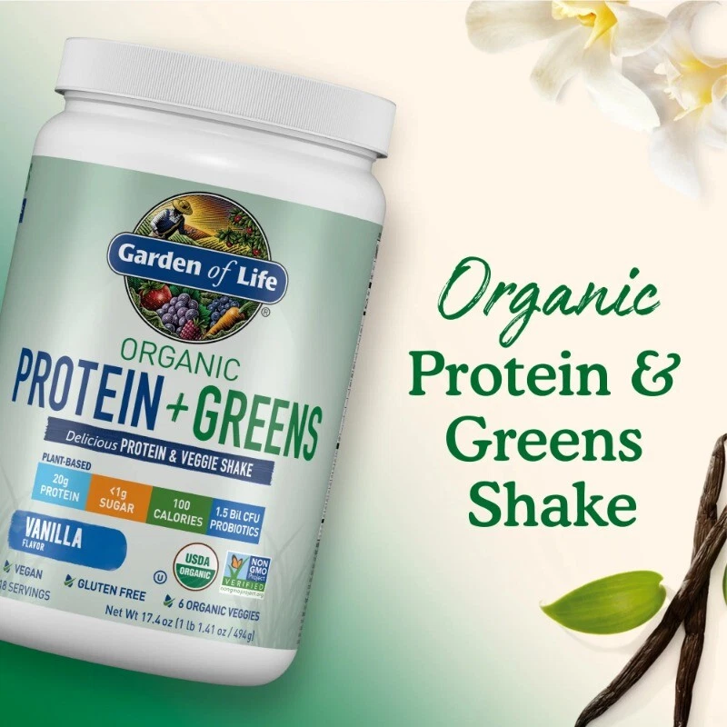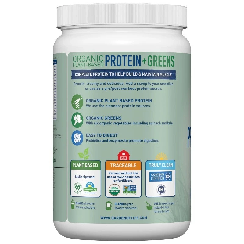 We combined the power of clean organic protein and the nutrient-rich energy of organic greens! Protein + Greens are CLEAN?Certified USDA Organic and Non-GMO Project Verified?and we think that CLEAN tastes better! Offering 20 grams of smooth, organic plant protein per serving from organic sprouted brown rice, organic peas, organic chia, organic navy beans, organic lentil beans and organic garbanzo beans and organic greens and veggies?organic alfalfa grass juice, organic spinach, organic kale, and organic broccoli, carrots and beets?1.5 billion CFU probiotics, non-GMO enzymes, 3 grams of organic fiber and less than 1 gram of naturally occurring sugar, Protein + Greens is a delicious way to get your protein and greens in one serving. And it?s CLEAN, TRACEABLE and PURE. Organic plant protein for healthy muscles and muscle repair; Healthy digestion; Green energy from organic greens and green juices; Great for the whole family; Perfect in your favorite recipes