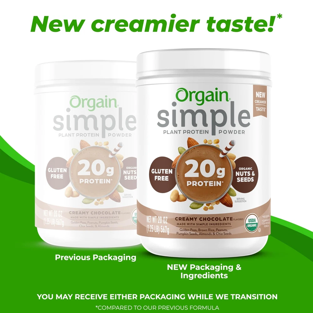 ’s Simple Protein powder is good, clean nutrition in its truest form. Crafted with only 8-10 clean, simple ingredients^, this is protein powder - elevated. Delicious, food-based ingredients, such as organic nuts and seeds, combine to create the perfect harmony of flavor and nutrition all while packing in 20g of vegan protein in every serving. Our Simple Protein powder is crafted from high-quality, organic ingredients with names you can recognize and pronounce: organic almonds, organic peanuts, organic chia seeds, organic pumpkin seeds, organic golden pea, and organic coconut sugar. It’s that simple. No stevia, erythritol, thickeners and gums. No gluten, soy, dairy, GMOs or artificial colors, flavors and preservatives either. No tricks or gimmicks. Certified Organic, this protein powder simply doesn't get any better. Sometimes simple is just plain better. Plus, when it comes to flavor and versatility, this powder delivers. This smooth and creamy powder can be enjoyed as a protein shake mixed with your liquid of choice (we love almond milk), as a delicious addition to a morning smoothie, or even baked into your next batch of cookies for an added nutritious twist in every bite. Go ahead, fuel up with the powder that's a treat for both your taste buds and your body so you can have energy to keep on going! *per serving ^varies by flavor ^^Source: IRI, Total US MULO, Latest 52 weeks ending 10.30.22 8-10 SIMPLE INGREDIENTS: Our protein powder is crafted from high-quality, organic ingredients with names you can pronounce: Organic pea, Organic chia seeds, Organic pumpkin seeds, Organic almonds, Organic peanuts & Organic coconut sugar. It’s that simple HIGHER STANDARDS: This product is vegan, gluten-free, kosher, made without soy ingredients & Non-GMO. You also won't find any carrageenan, lactose or dairy ingredients, artificial colors, flavors, sweeteners, or preservatives, stevia, erythritol & gums! CUSTOMIZE ANY WAY YOU WANT: You can mix this with any liquid like water, almond milk, oat milk or blend it to create a delicious shake or smoothie USDA ORGANIC & CERTIFIED PLANT-BASED: To ensure we are delivering high-quality products, we use third parties to verify that we are certified USDA Organic and certified plant-based PERFECT FOR ANY LIFESTYLE: This protein powder is perfect for men and women alike, whether you’re maintaining a healthy lifestyle, working out, looking to add more protein to your diet, or following a diet regiment WHAT TO EXPECT: Includes 1 (1.25 lb) Simple Organic Creamy Chocolate Plant Protein Powder