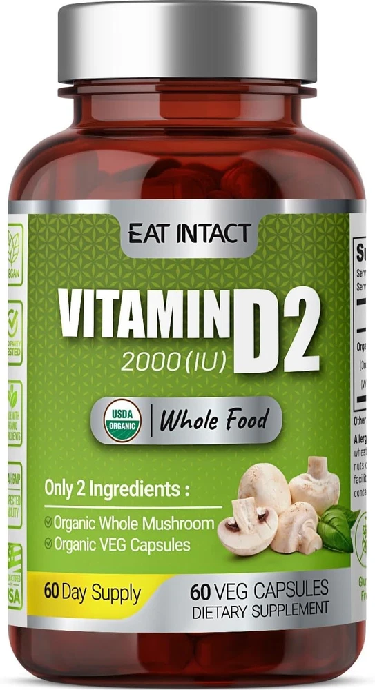 EATINTACT Organic Vegan Whole Food Vitamin D2, 2000 IU (50 mcg), Two Ingredients(Organic Whole Mushroom and Organic Vegan Capsule), Non-GMO, Third Party Tested, Support Strong Bone and Immune Health, 60 Day Supply Experience the unparalleled distinction of our product, the only organic, vegan, and truly whole food vitamin D. Our whole food vitamin D stands true to its name, produced organically from a single ingredient, whole mushrooms 🍄, rich in naturally boosted levels of Vitamin D. With our transparent and minimal process, we guarantee only the best for you. Our organically and sustainably grown whole mushrooms 🍄are exposed to UV light ☀️, mirroring the natural Vitamin D production in our bodies. Post-drying, these mushrooms are pulverized into fine powder and carefully encapsulated into organic capsules. Just two ingredients in our product - organic whole mushroom 🍄and veg organic capsule 💊 - exemplify our belief in simplicity and maximum efficacy. Assured quality is our motto, with every batch third-party tested ✔️for potency, heavy metals, and gluten, reinforcing our commitment to your well-being. Unlike other brands, we are happy to share our test results with you. If you're health-conscious, holistic enthusiast, vegan 🌿,and vegetarian, this is the best informed choice for you. Our Vitamin D ticks all the boxes, offering whole food, organic, non-GMO, components free from extraction, purification, solvents, binders, carriers, natural and artificial flavors, sweeteners, and colors. Proudly made in the USA, our whole mushroom Vitamin D is organically and sustainably grown, minimally processed, and encapsulated right here in the United States, ensuring the highest standards of quality and care. Satisfaction guaranteed 💯: We’re proud of our products. If you aren’t satisfied, we’ll refund you for any reason within 30 days of purchase.