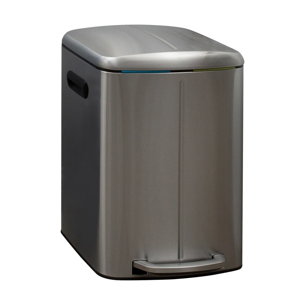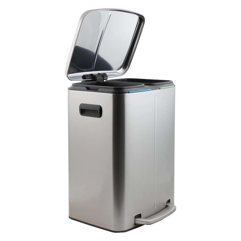 Make clean up easy with the Organize It All 40 Liter Dual Compartment Recycling Bin. This recycling bin is perfect for any space with its compact construction and sleek stainless-steel finish that prevents fingerprints. Holds up to 40 Liters, making it large enough to get you through several days without having to take out the recycles. Each compartment has a removable liner to make taking out the recycles easier for you. Designed with a convenient hands-free step pedal for easy opening with soft closing hinges. The lid traps odors and prevents overflowing. A must have for every home! Free Shipping Over $49.99* Details Organize It All 40 L Dual Compartment Recycling Bin Product Description: Make clean up easy with the Organize It All 40 Liter Dual Compartment Recycling Bin. This recycling bin is perfect for any space with its compact construction and sleek stainless-steel finish that prevents fingerprints. Holds up to 40 Liters, making it large enough to get you through several days without having to take out the recycles. Each compartment has a removable liner to make taking out the recycles easier for you. Designed with a convenient hands-free step pedal for easy opening with soft closing hinges. The lid traps odors and prevents overflowing. A must have for every home!