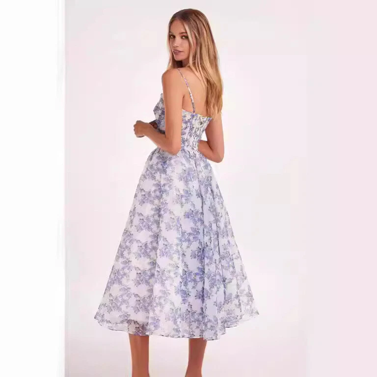 This charming midi-length dress features spaghetti straps, a flared skirt, and a fitted ruched bodice with a lace detail at the back. Made from printed organza in a pastel blue floral design, it offers a feminine silhouette. Key details include a square neckline, A-line shape. Shipping Information: Order Processing: Please allow 1-3 business days for us to process your order after payment. Shipping Time: Once processed, your order will be shipped and typically takes 7-14 business days to arrive at your destination. Size: International Size Chart International Size US Size Bust (cm) Waist (cm) Hips (cm) XXS 0 76 58 82 XS 0 80 62 86 XS 2 84 66 92 S 4 88 70 96 S 6 92 74 100 M 8 96 78 104 M 10 100 82 108 L 12 104 86 112 L 14 108 90 116 XL 16 112 94 120 Note: 1. Asian sizes are 1 to 2 sizes smaller than European and American people. Choose the larger size if your size between two sizes. Please allow 2-3cm differences due to manual measurement. 2. Please check the size chart carefully before you buy the item, if you don't know how to choose size, please contact our customer service. 3.As you know, the different computers display colors differently, the color of the actual item may vary slightly from the following images. Packing list: 1*Dress Product Image: