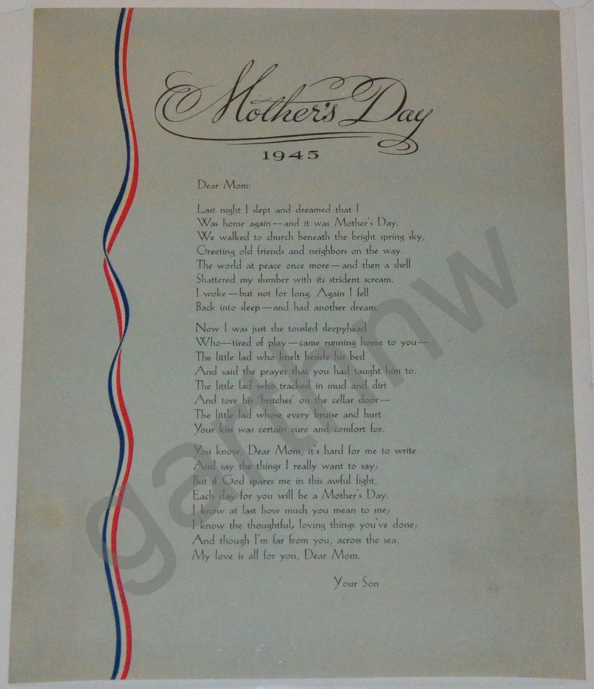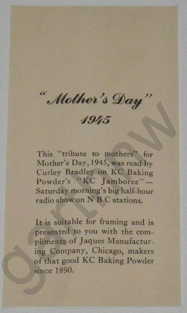 Here you have a wonderful bit of VINTAGE MOTHER'S DAY and WORLD WAR II MEMORABILIA! Please...SEE THE SCANS! This is AN EXTREMELY RARE ORIGINAL 1945 SOLDIER'S MOTHER'S DAY POEM that comes with its original mailing tube and company insert. You can read the moving words of the poem yourself by seeing the scans. (The watermarks are mine, not on the original.) This "MOTHER'S DAY" 1945 was originally read by CURLEY BRADLEY on the KC BAKING POWDER'S "KC JAMBOREE" carried on NBC radio stations. The company that produced the baking powder was JAQUES MANUFACTURING of Chicago. This gem measures 10 inches X 13 inches. The condition should be clear from the scans. THIS HAS NEVER BEEN USED! It came out of a box stored since World War II. There is some discoloration of the paper. The smaller enclosed note measures 6 inches X 3 inches. This is all gently treated and truly rare as a collection like this! This is a great piece FOR THE COLLECTOR! Take it home with you! Please Check Out My Ebay Store for more great memorabilia! I am happy to send this to any country. 1st class international air postage will be charged… More excellent packaging and free shipping here in the United States! THANKS! 050821