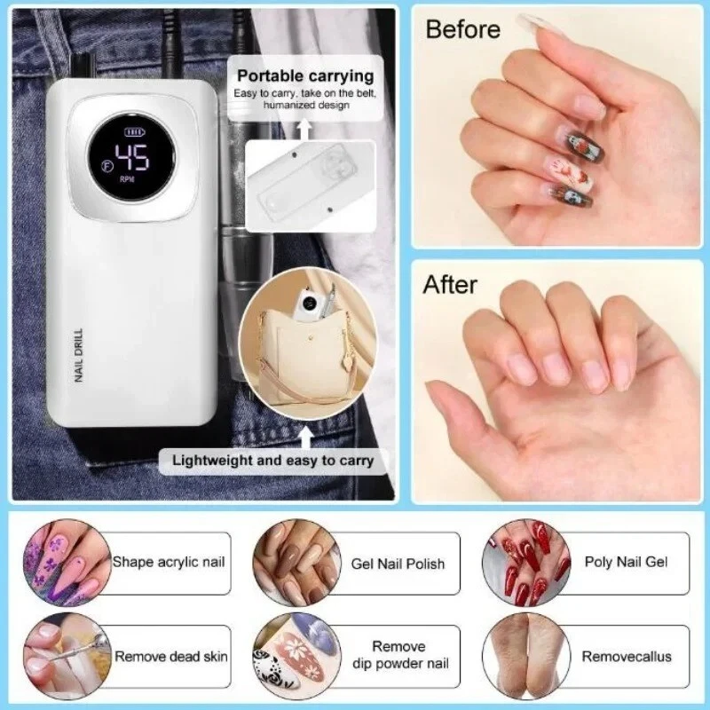 Original 45000RPM Professional Rechargeable Electric Nail Drill Machine Portable Cordless Nail File for Acrylic & Gel Nails – Nail Art Tool for Home & Salon Use Upgrade your nail care routine with this Professional Electric Nail Drill . Designed for both beginners and professionals, this cordless, rechargeable drill offers powerful performance with up to 45,000 RPM , making it ideal for shaping, filing, and removing acrylics, gels, and even cuticles. Key Features: High-Speed Performance : Reaches speeds up to 45,000 RPM , allowing for quick and efficient nail filing. Rechargeable & Cordless : Enjoy the freedom of movement with a rechargeable battery, making it ideal for on-the-go use. Multi-Function Use : Perfect for acrylic nails, gel nails, natural nails, and cuticle care. Adjustable Speed Control : Easily adjust the speed to suit your nail care needs, from shaping and filing to buffing and polishing. Portable & Lightweight : Compact design ensures portability for use at home, in salons, or while traveling. Low Noise & Vibration : Operates with minimal noise and vibration, offering a smooth, quiet experience. Ergonomic Design : Comfortable grip and user-friendly controls for effortless operation. Package Includes: Electric Nail Drill Machine Rechargeable Battery Set of Nail Drill Bits Charging Cable User Manual Whether you're a professional nail technician or an at-home enthusiast, this Electric Nail Drill is the perfect tool to enhance your nail care. From removing old acrylics to perfecting nail art designs, it handles it all with ease! Order Today & Enjoy Effortless Nail Care! This description highlights the key features of the product while making it appealing to potential buyers looking for a high-quality nail drill for personal or professional use.