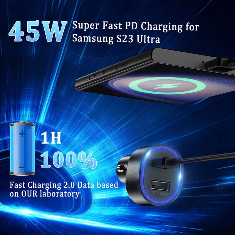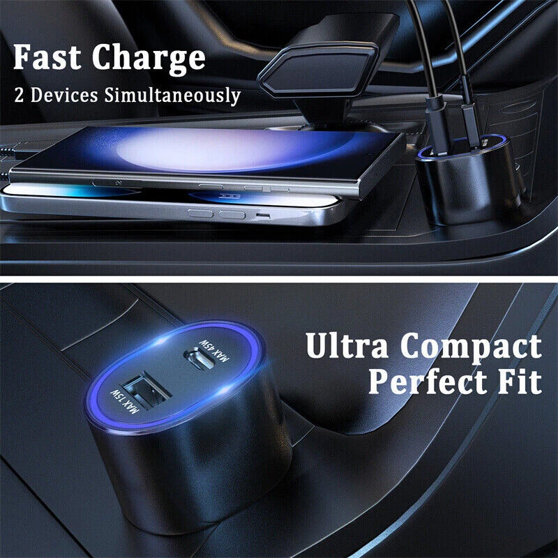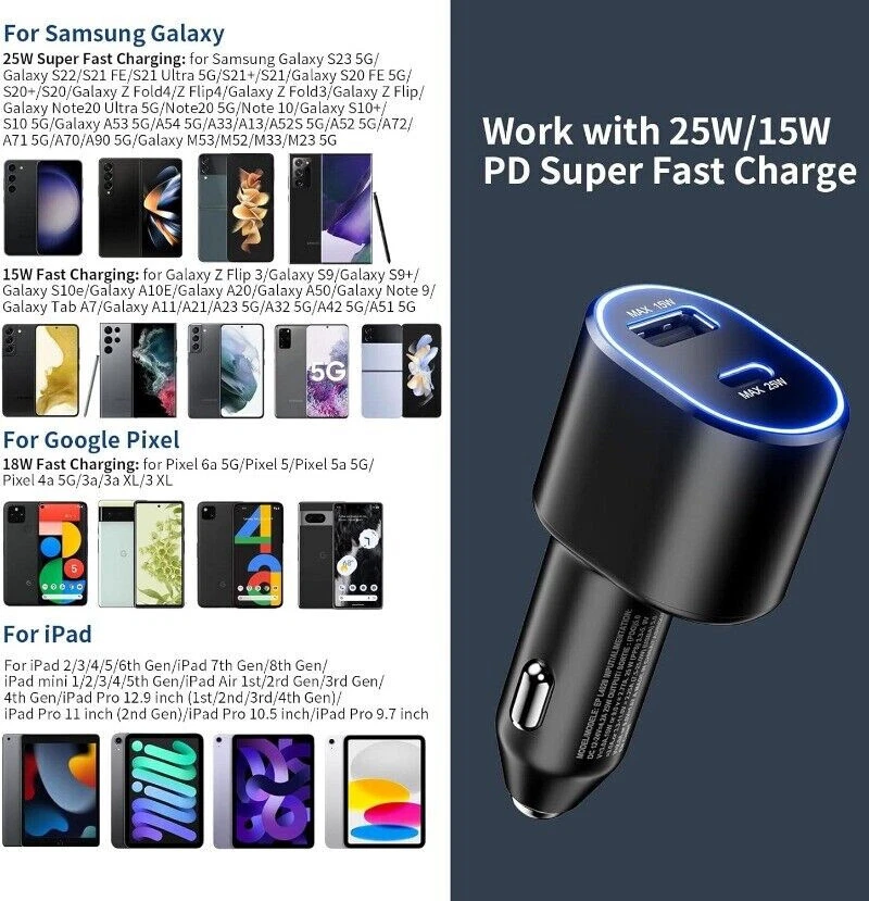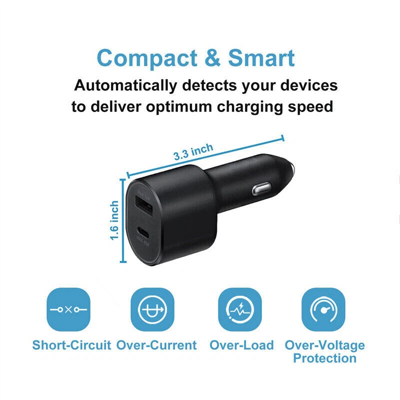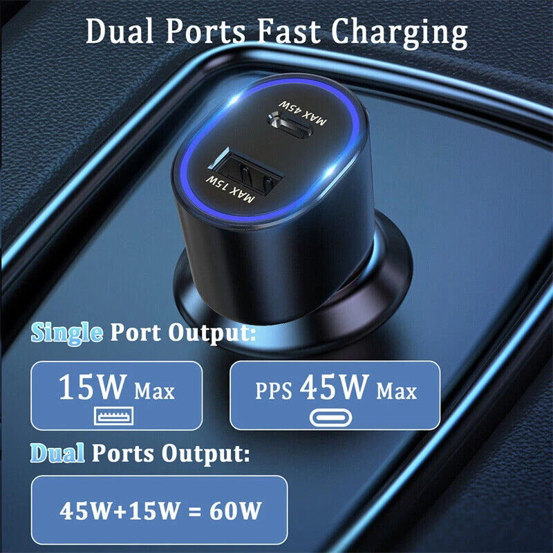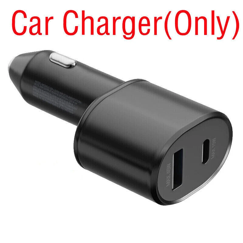 Interface : 45w usb type C + 15w usb type A Input : 12-24V Output : PDO : 5V3A / 9V3A / 15V3A / 20V2.25A PPS : 3.3-20V 2.25A (7.5-45W) USB-A : 5V2A / 9V1.67A Cable : USB-C to USB-C Interface Car charger can charge two devices at the same time . Support PD3.0/QC3.0/QC2.0/AFC/FCP . Port 1 : 45WType-C connector . Support PD3.0/Q Super Fast Port 2: 15W USB connector . Support PD3.0/Q Super Fast Build: METAL&ABS MATERIAL SAFE SECURITY: The solid full Aluminum Alloy body features exquisite texture and durable lifetime, and protects your devices from over-heating, over-voltage, over-current. Package includes: 1 x 45W Dual Port Car Charger Or 1 x 45W Wall Charger Or 3ft/6ft Cable