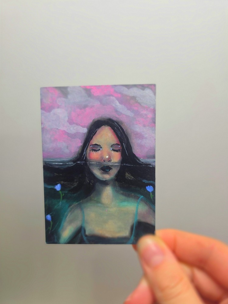 Title: Stay Afloat Year: 2026 Artist: Chasmar Design Format: ACEO (Art Cards, Editions & Originals) This listing is for an original, one-of-a-kind ACEO painting — not a print or reproduction. A soft, surreal portrait suspended between water and sky. With muted tones and gentle contrasts, this piece captures a quiet moment — balancing calm and vulnerability beneath a dreamlike surface. ✨ Details: Original handmade ACEO artwork (OOAK) Subject: Surreal portrait / floating figure / dreamy ocean scene Medium: Oil pastel and acrylic Surface: Watercolor paper Finish: Sealed with protective varnish Signed + titled + dated on the back Size: Standard ACEO (approx. 2.5 x 3.5 inches) 📦 SHIPPING (Tracked / eBay Standard Envelope) Ships via eBay Standard Envelope with tracking. Carefully packaged in a protective sleeve with rigid support to prevent bending during transit.